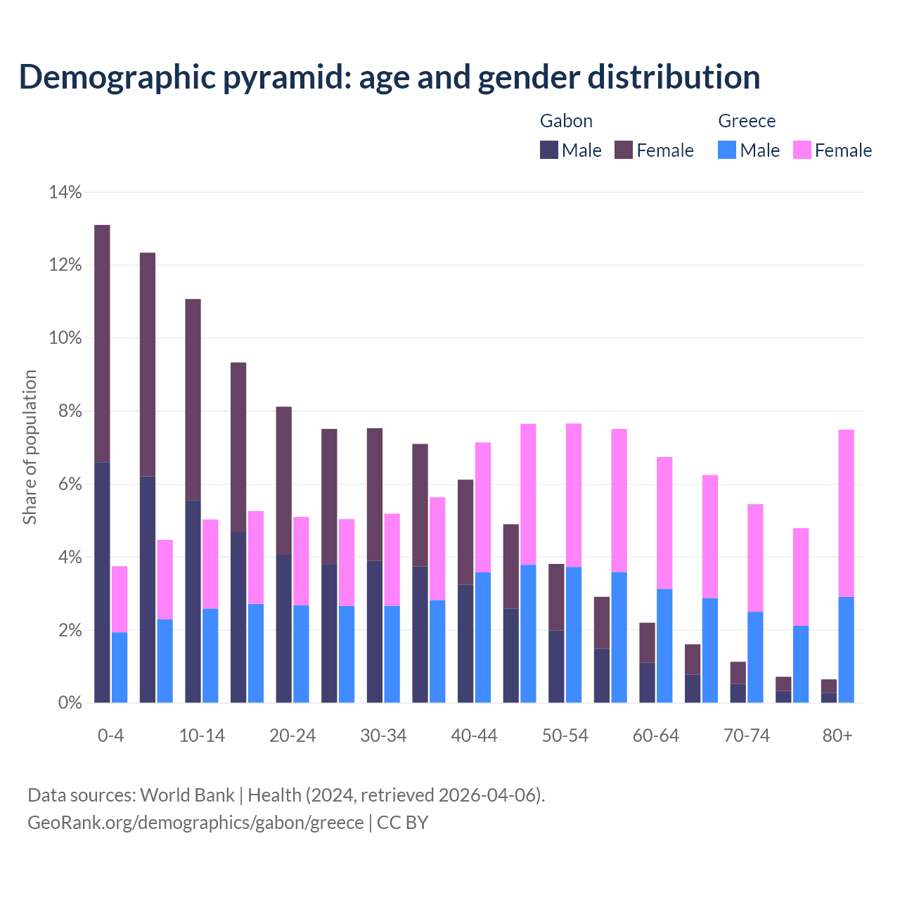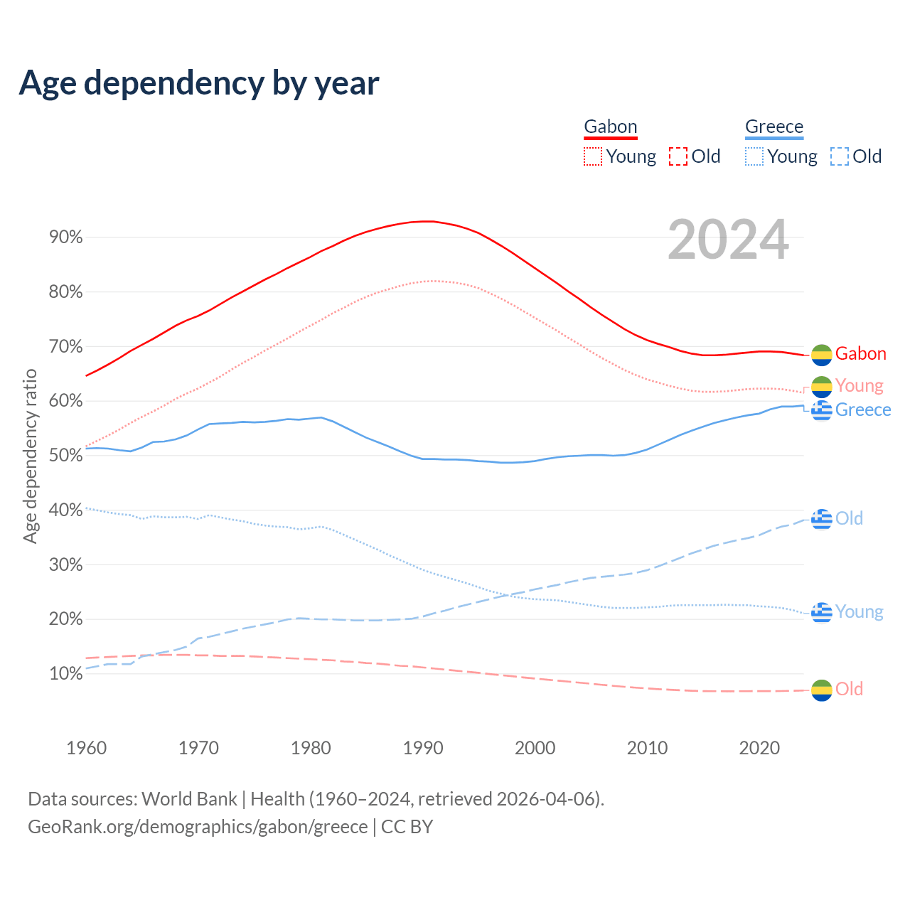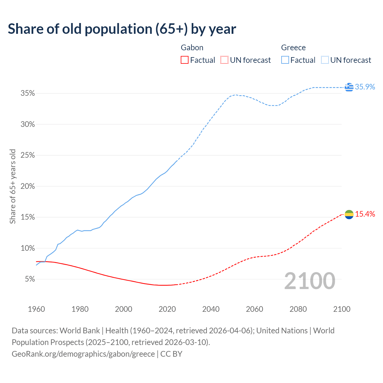 - The share of old-age demographic (65+) in Gabon is 4.08% vs 23.9% in Greece.
