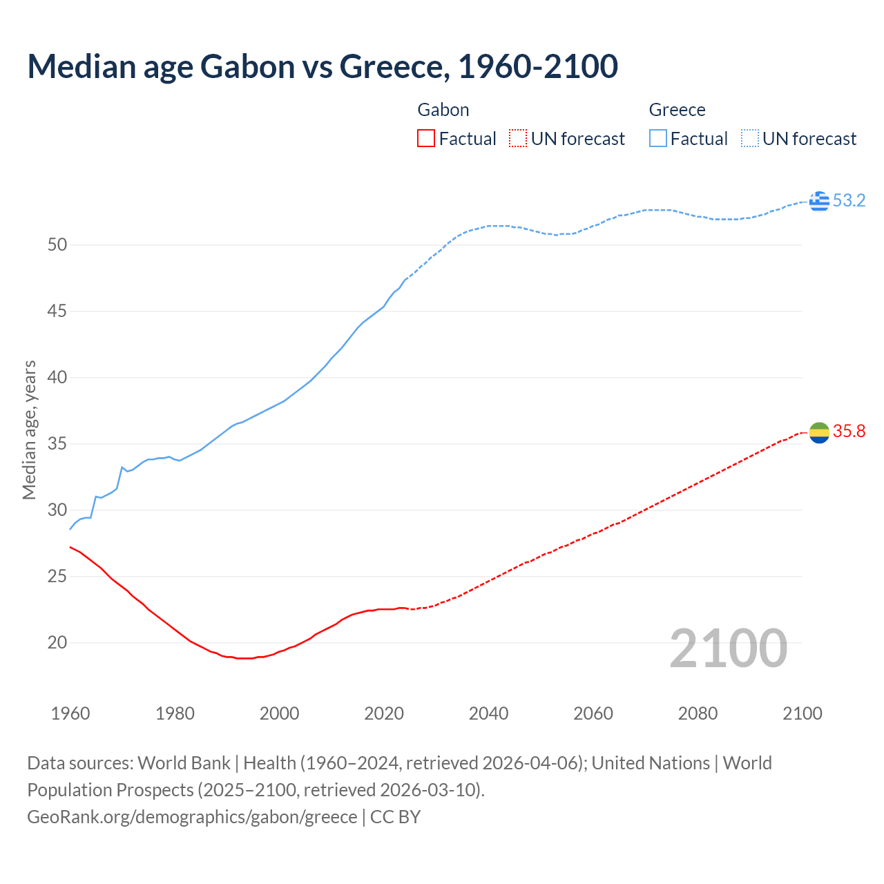 - The median age in Gabon is 22.6 years compared to 47.3 years in Greece.