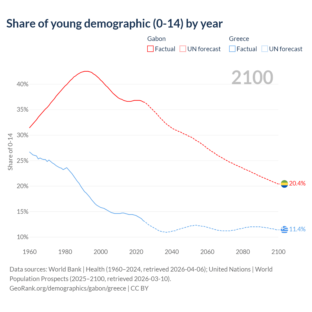 - The share of young demographic (0-15 years old) in Gabon is 36.5% vs 13.2% in Greece.