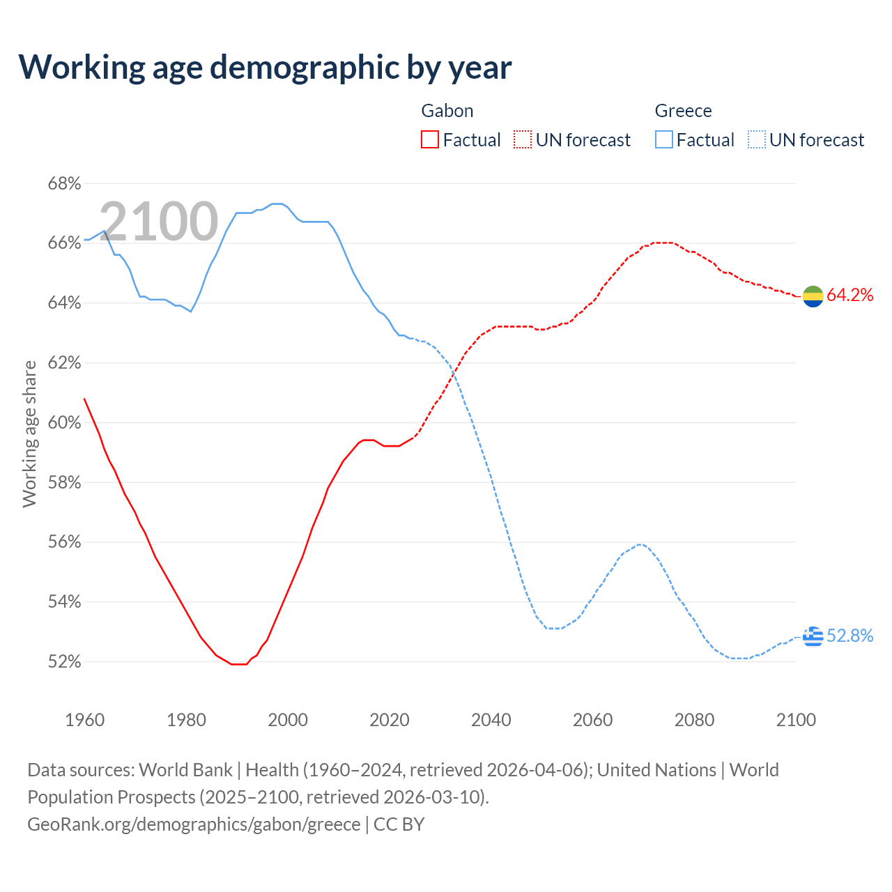 - Gabon has 1.58M working age adults (aged 15-64) vs 6.4M in Greece.