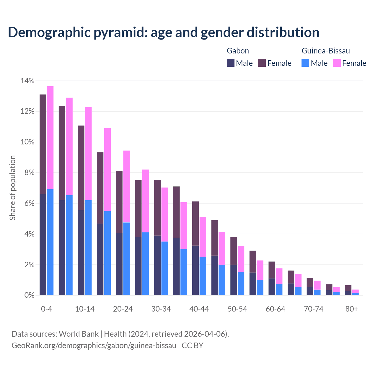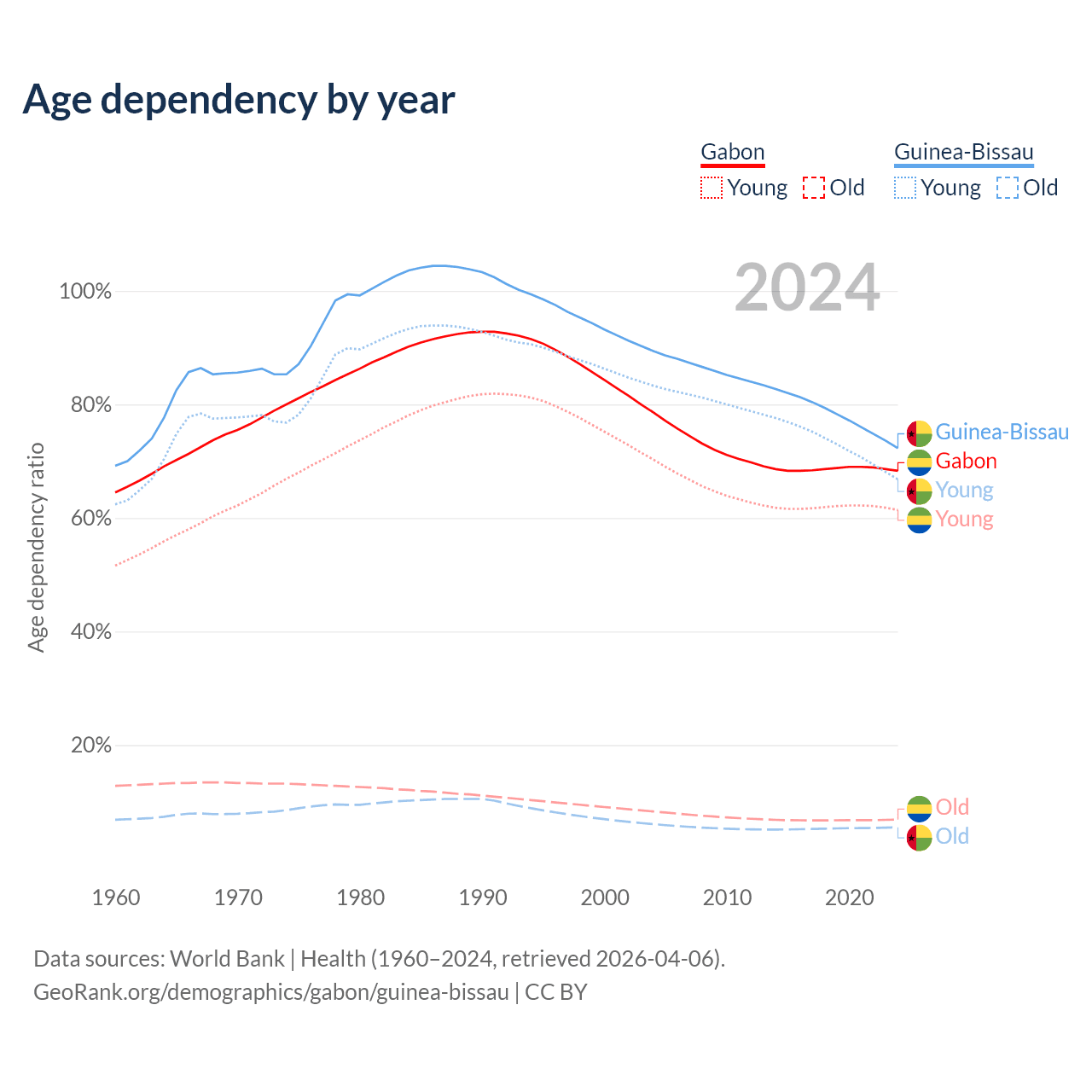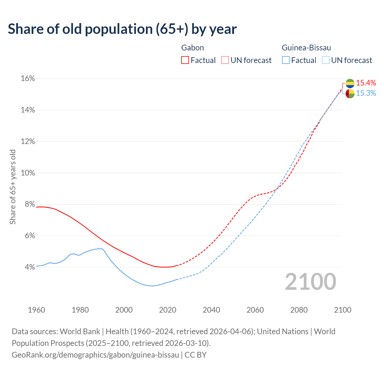 - The share of old-age demographic (65+) in Gabon is 4.08% vs 3.19% in Guinea-Bissau.