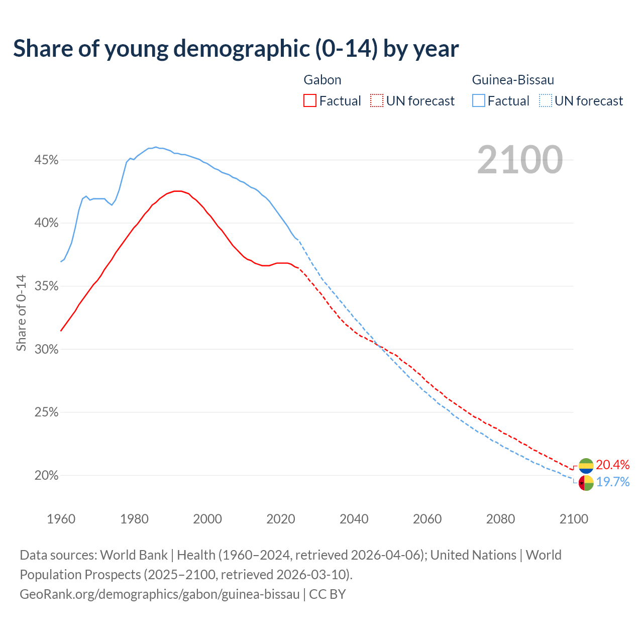 - The share of young demographic (0-15 years old) in Gabon is 36.5% vs 38.8% in Guinea-Bissau.