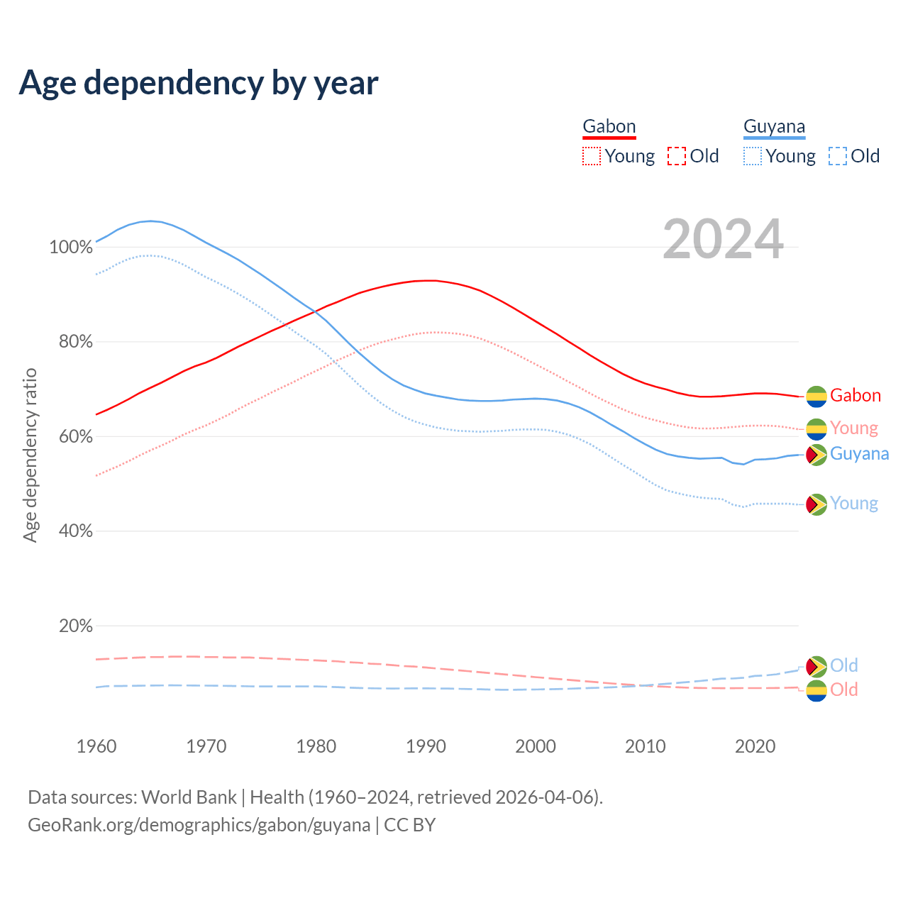 - The share of old-age demographic (65+) in Gabon is 4.08% vs 6.73% in Guyana.