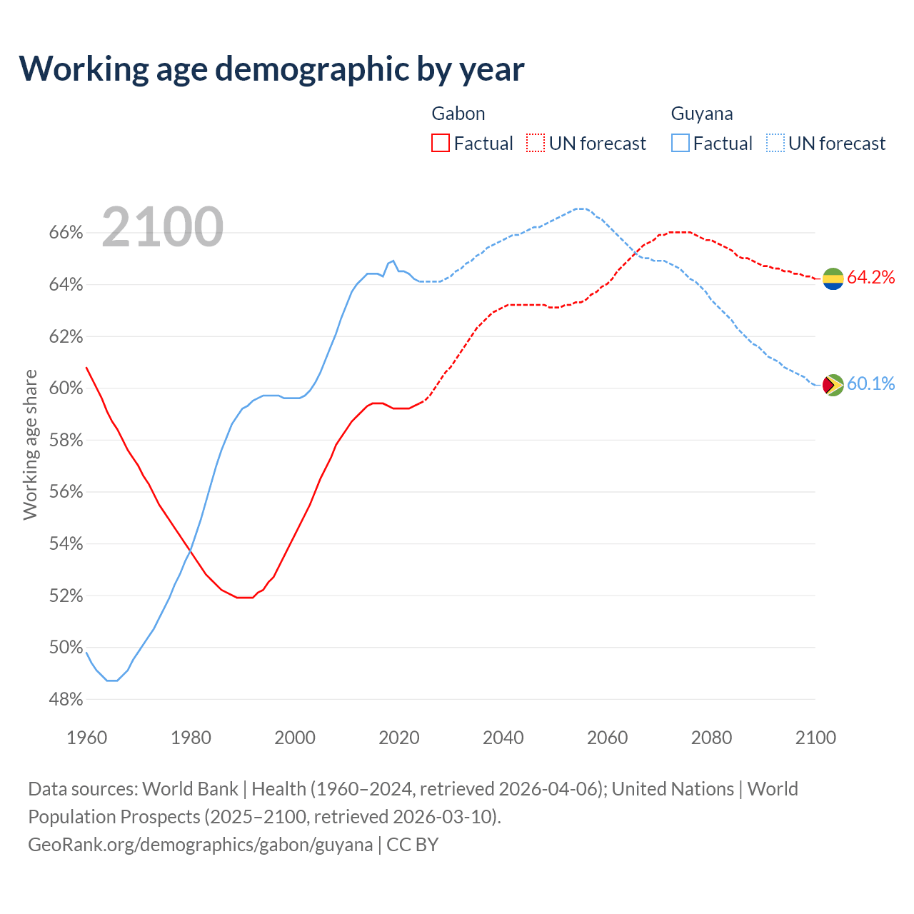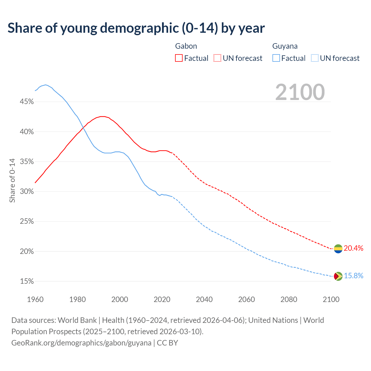 Median age Gabon vs Guyana, 1960-2100