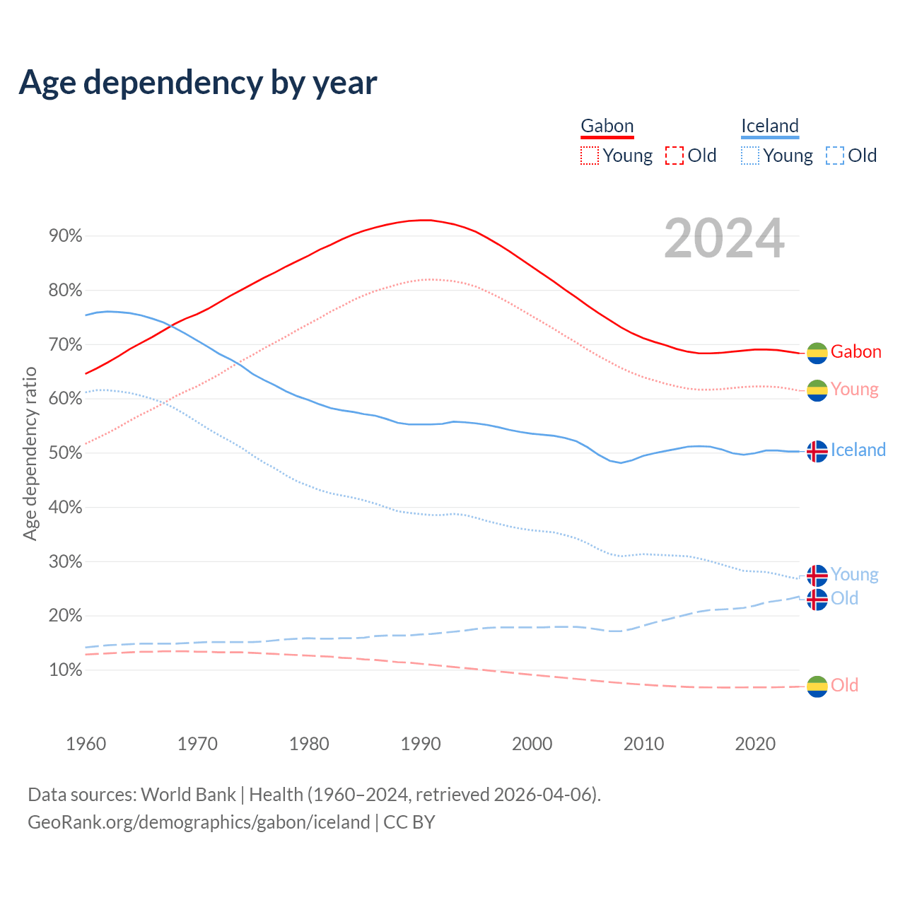 - Gabon is ranked 144/196 by median age (oldest to youngest) vs 65/196 for Iceland.