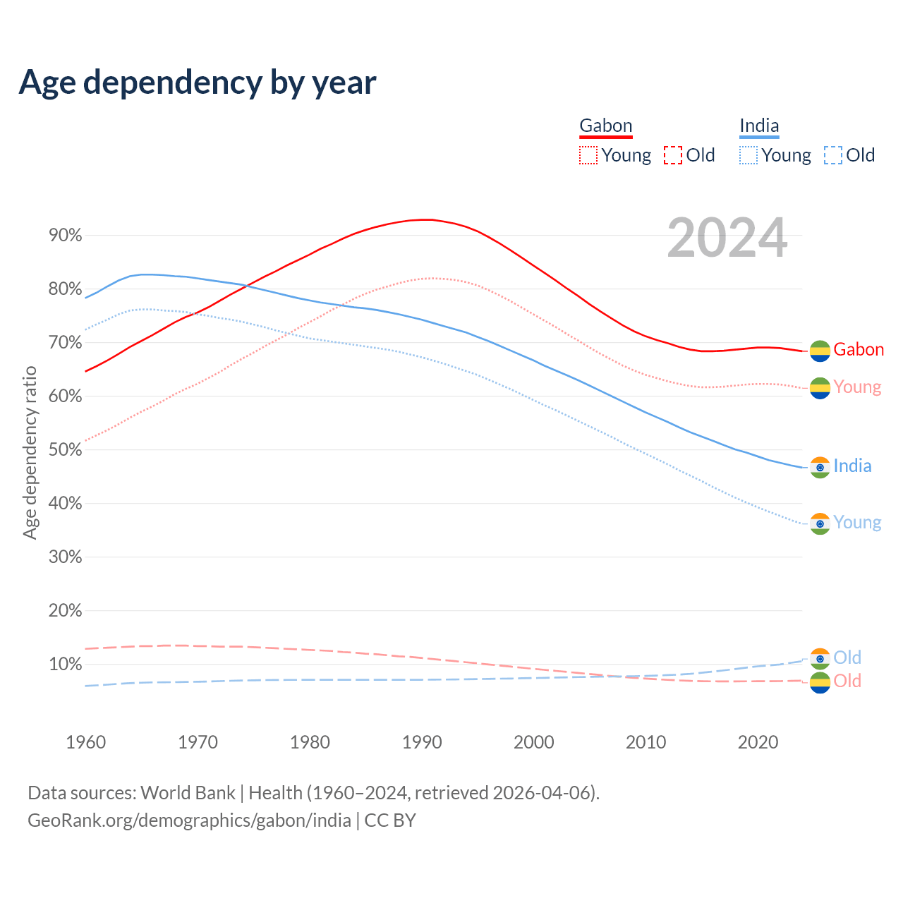 - Gabon is ranked 144/196 by median age (oldest to youngest) vs 108/196 for India.