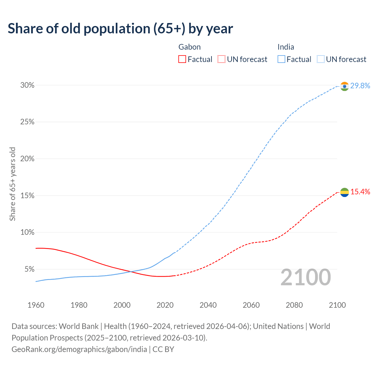 - The share of old-age demographic (65+) in Gabon is 4.08% vs 7.15% in India.