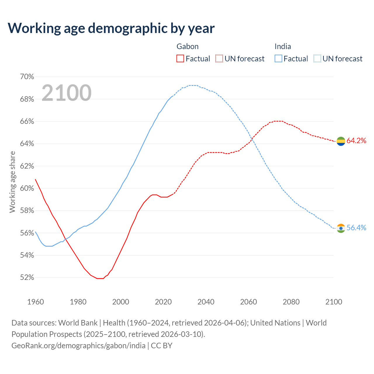 - Gabon has 1.58M working age adults (aged 15-64) vs 1.01B in India.