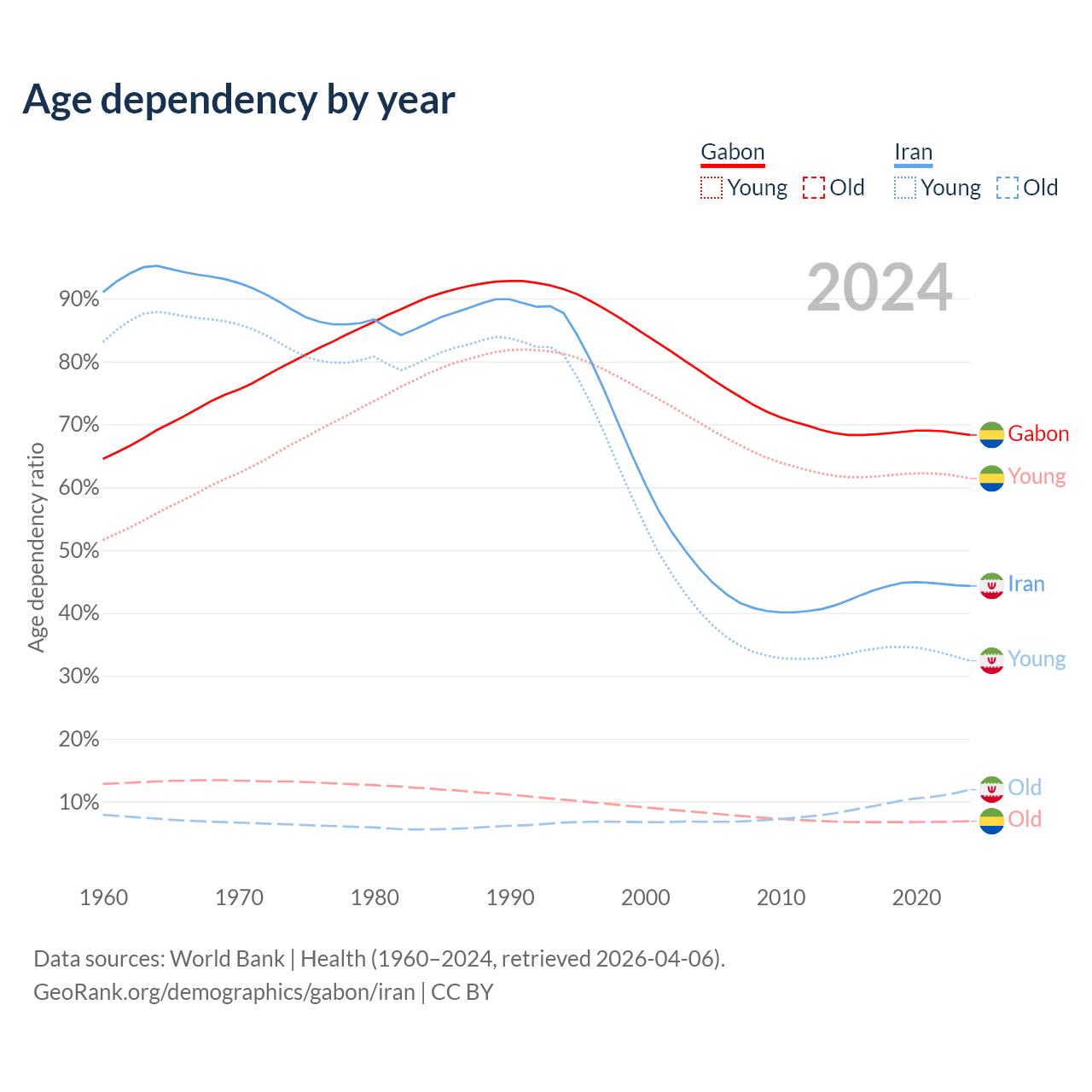- The share of old-age demographic (65+) in Gabon is 4.08% vs 8.24% in Iran.