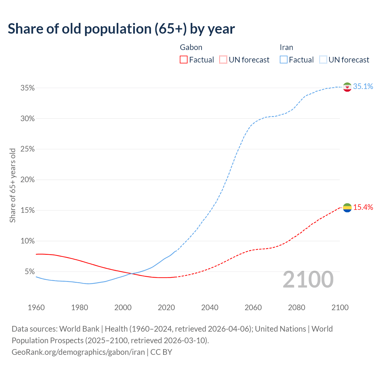 The share of older people aged 65 and over is 4.08% in Gabon and 8.24% in Iran. Life expectancy in Gabon compared to Iran .