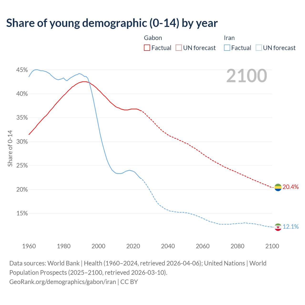 - The share of young demographic (0-15 years old) in Gabon is 36.5% vs 22.4% in Iran.