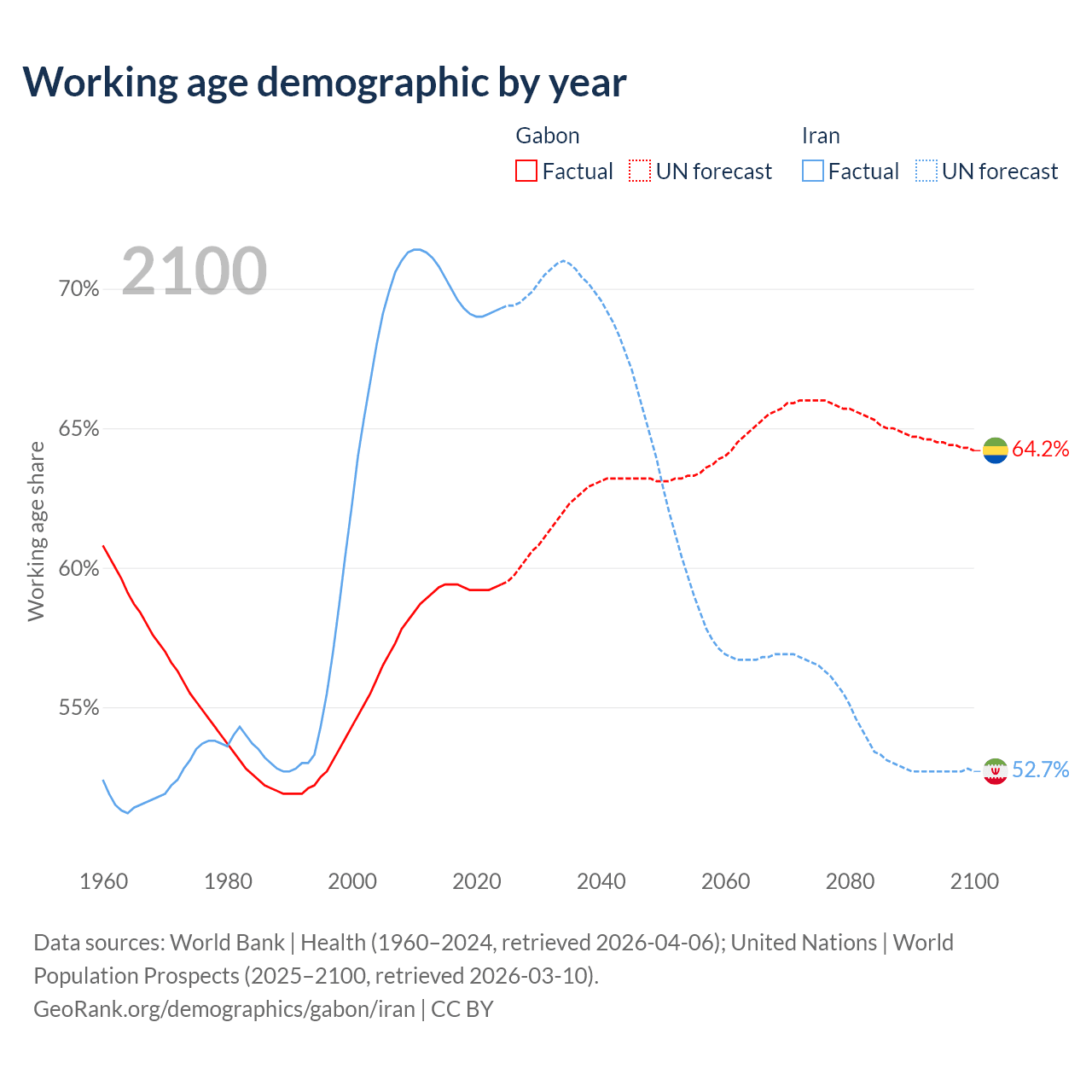 - Gabon has 1.58M working age adults (aged 15-64) vs 64.8M in Iran.