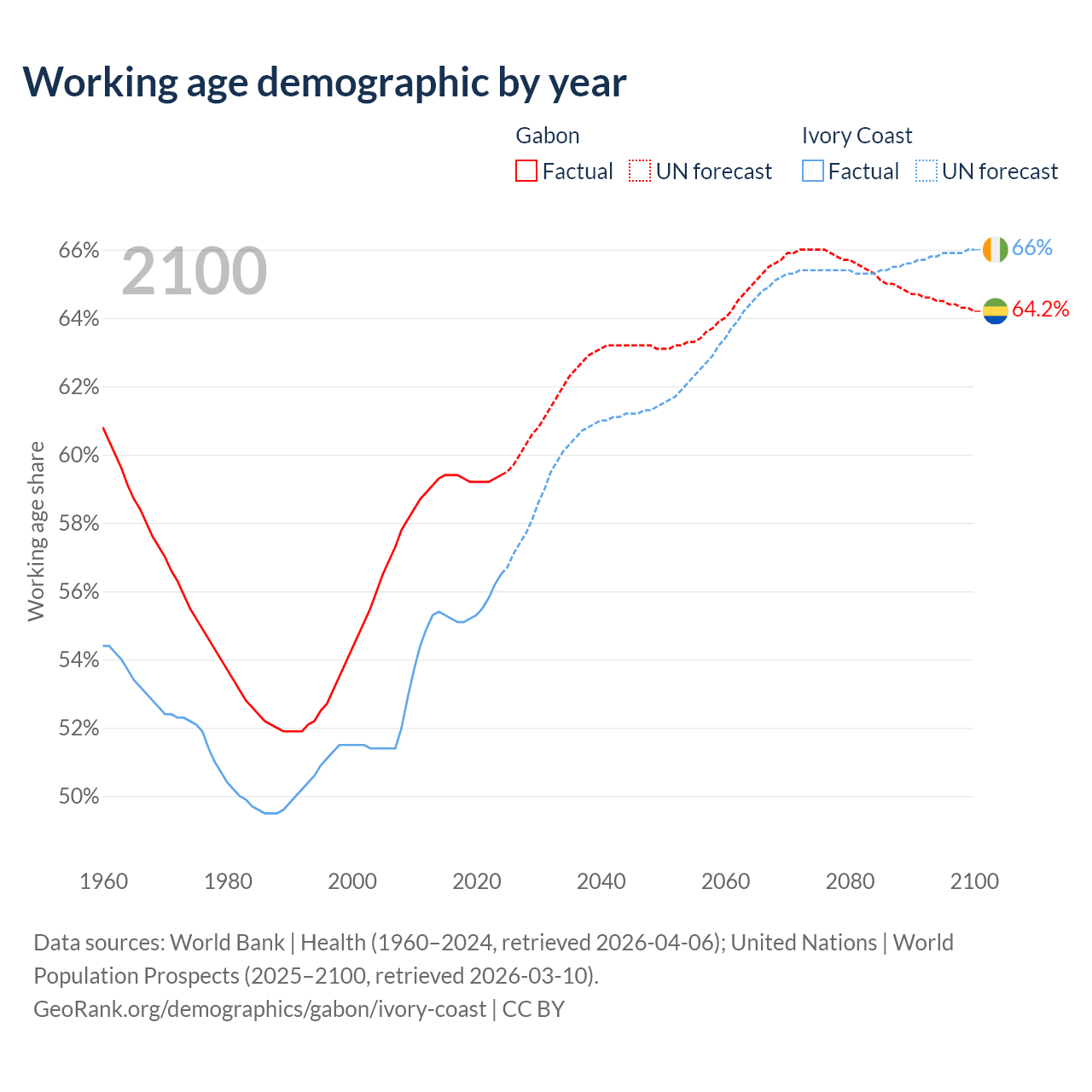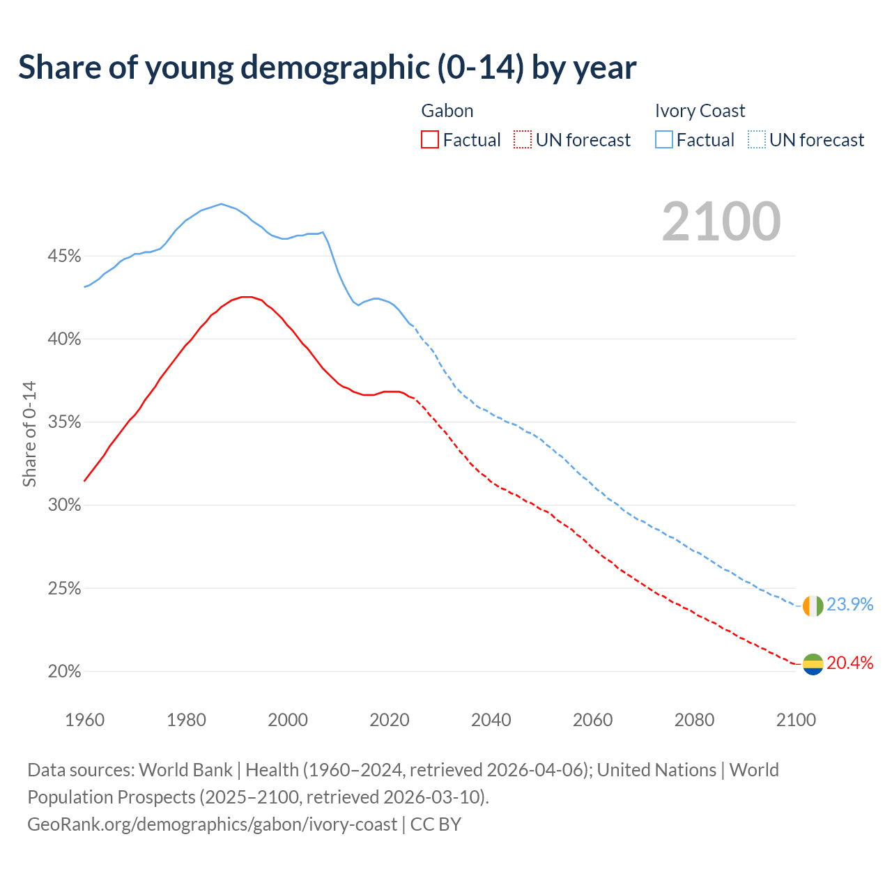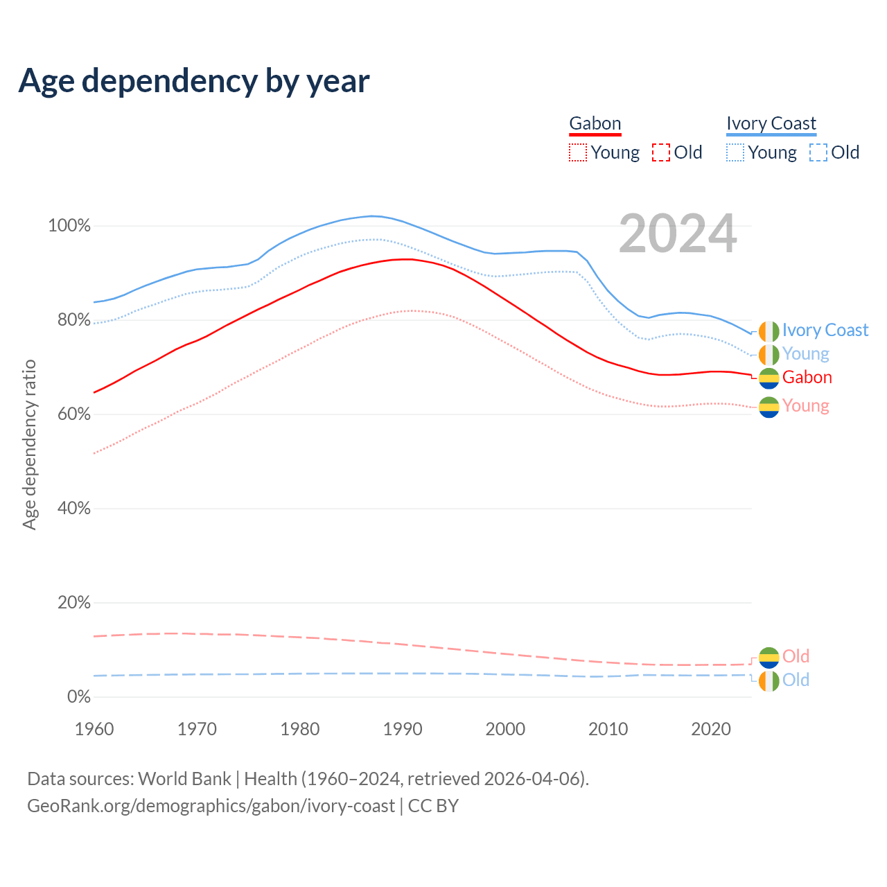 - Gabon is ranked 144/196 by median age (oldest to youngest) vs 175/196 for Ivory Coast.