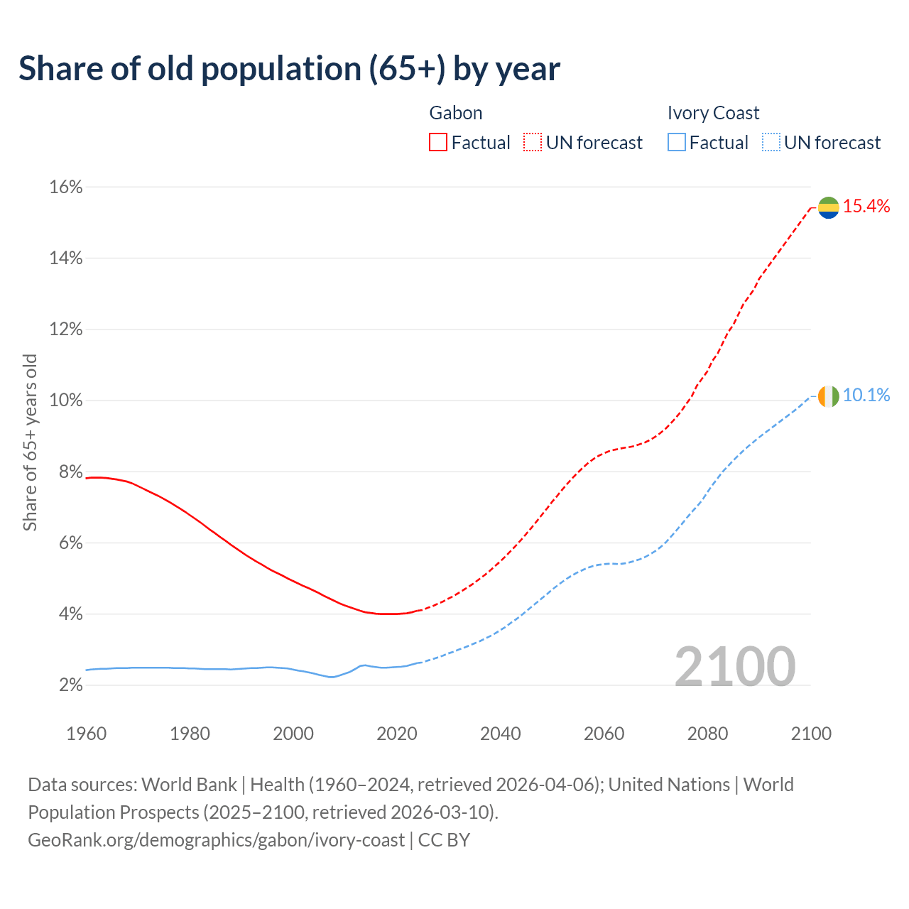 - The share of old-age demographic (65+) in Gabon is 4.08% vs 2.61% in Ivory Coast.