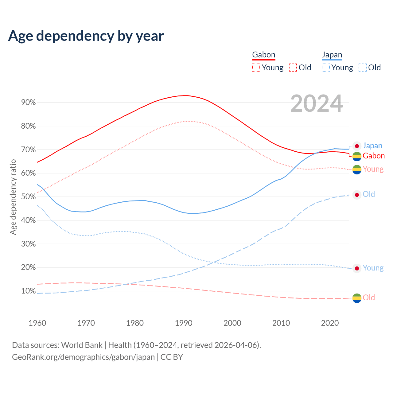 - Gabon is ranked 144/196 by median age (oldest to youngest) vs 2/196 for Japan.