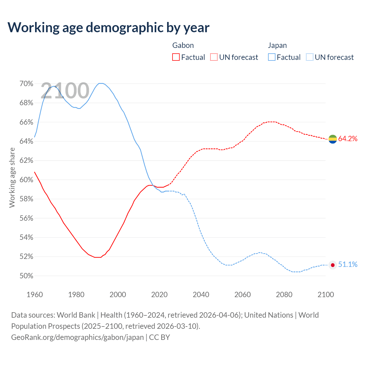 - Gabon has 1.58M working age adults (aged 15-64) vs 72.1M in Japan.