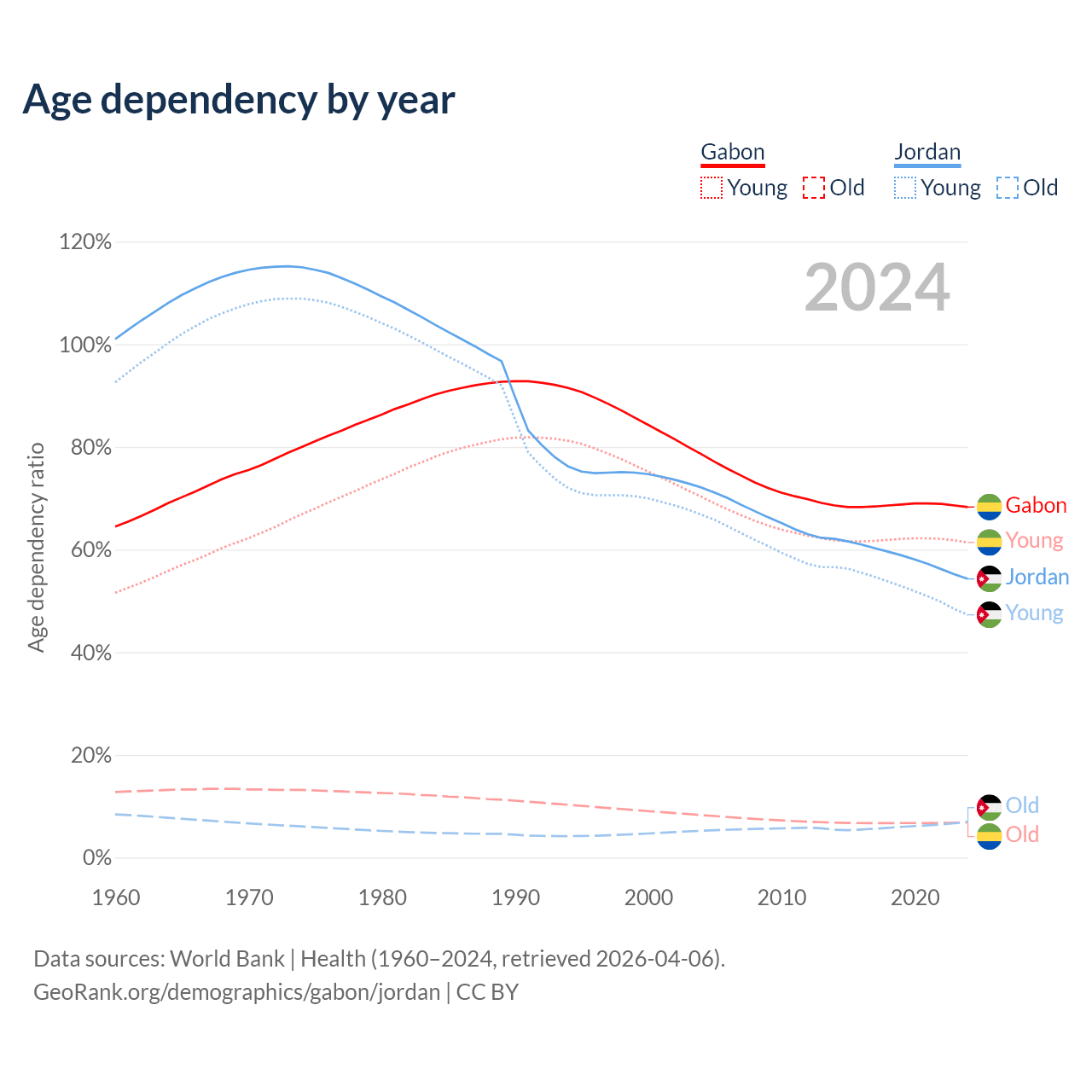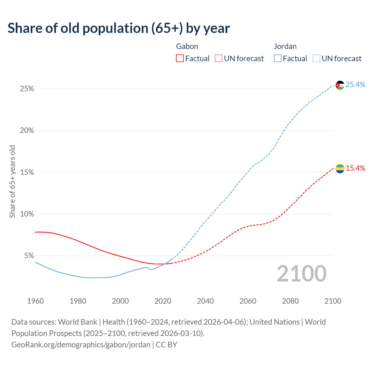 - The share of old-age demographic (65+) in Gabon is 4.08% vs 4.52% in Jordan.