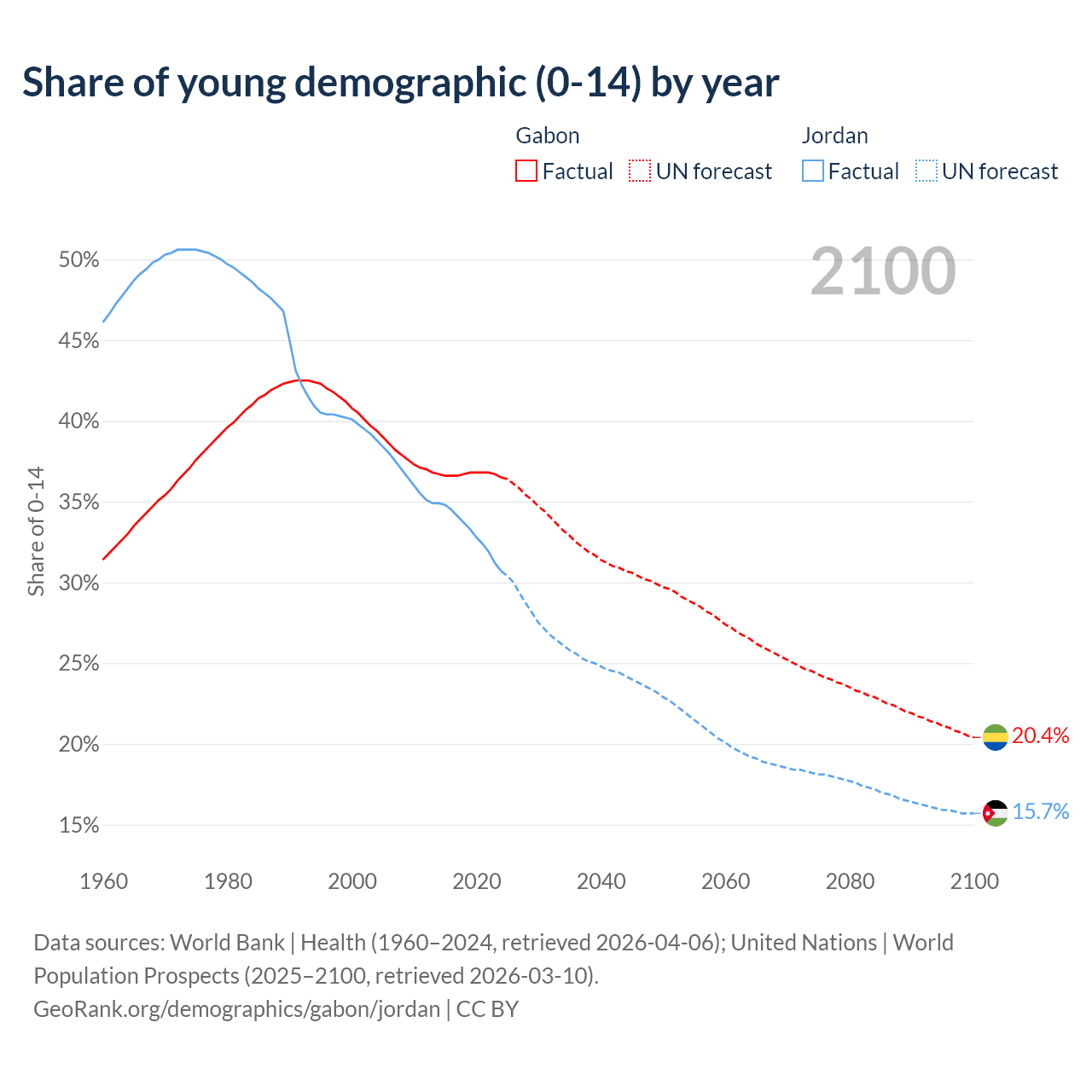 - The share of young demographic (0-15 years old) in Gabon is 36.5% vs 30.7% in Jordan.