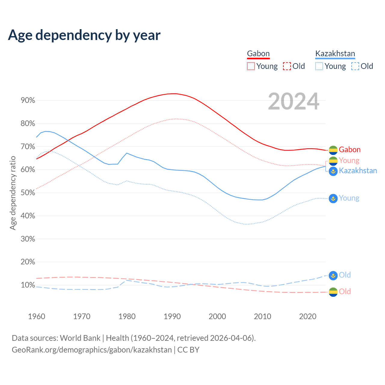- Gabon is ranked 144/196 by median age (oldest to youngest) vs 99/196 for Kazakhstan.