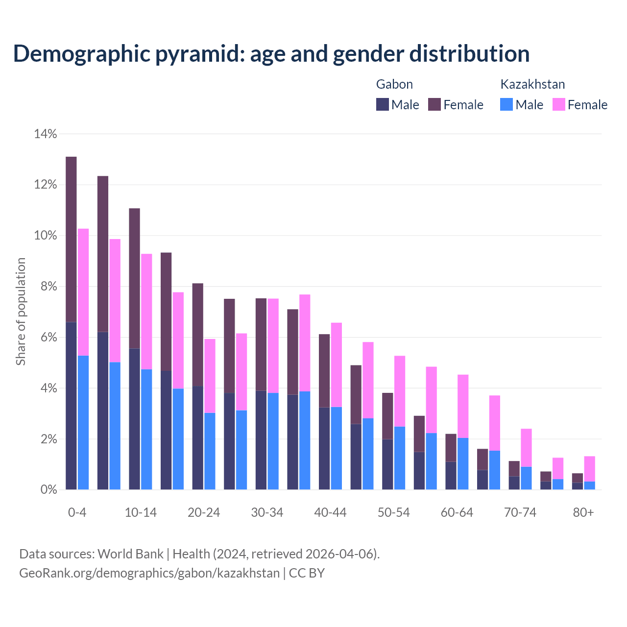 The share of older people aged 65 and over is 4.08% in Gabon and 8.65% in Kazakhstan. Life expectancy in Gabon compared to Kazakhstan .