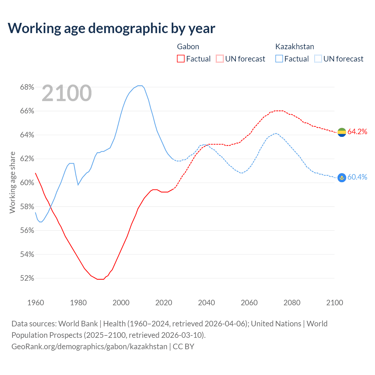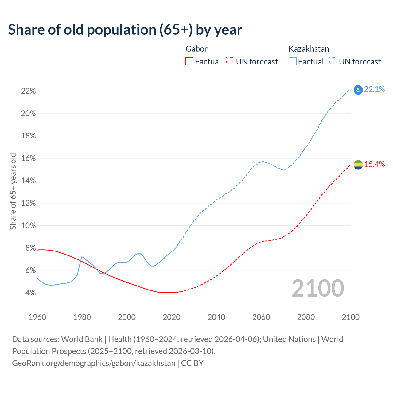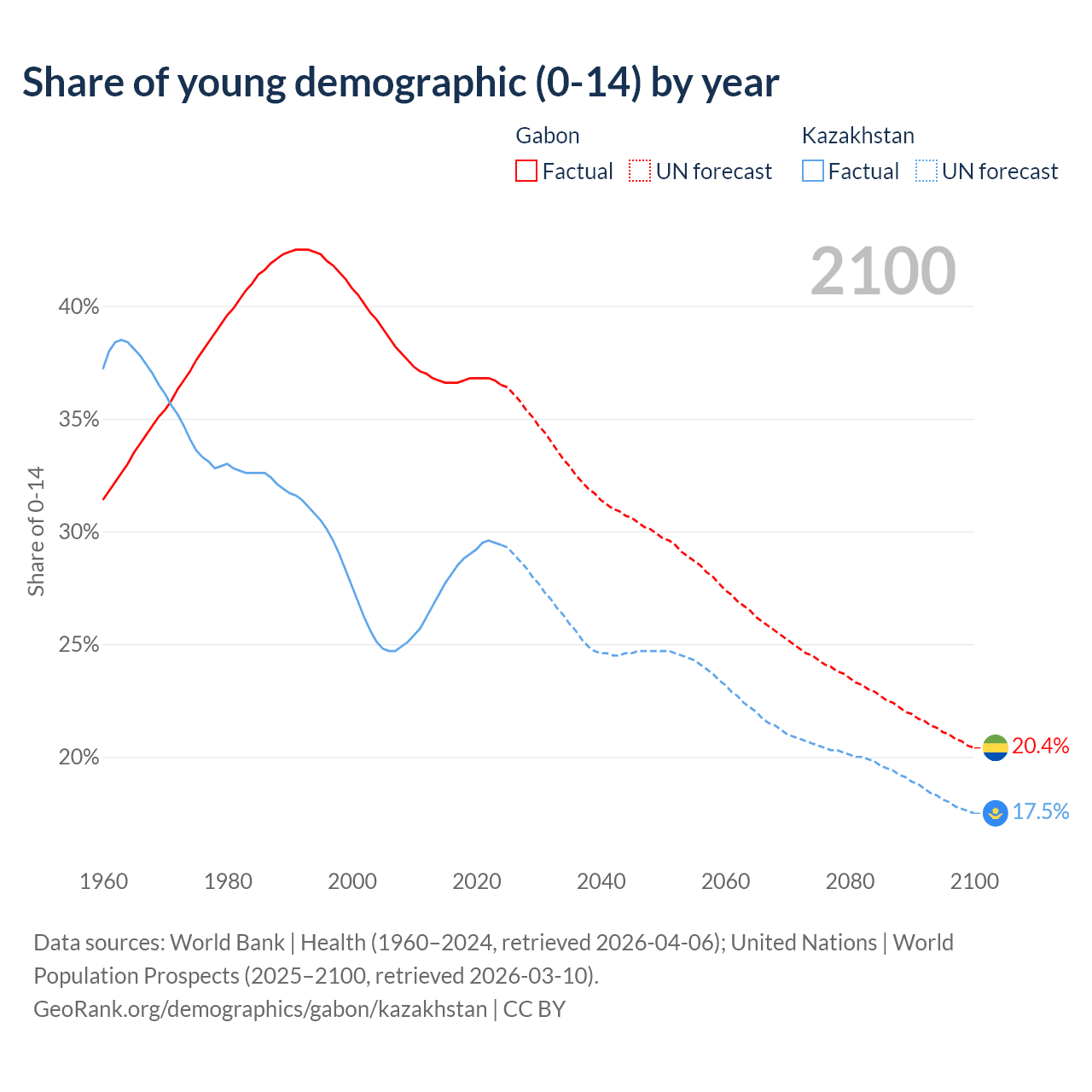 Median age Gabon vs Kazakhstan, 1960-2100