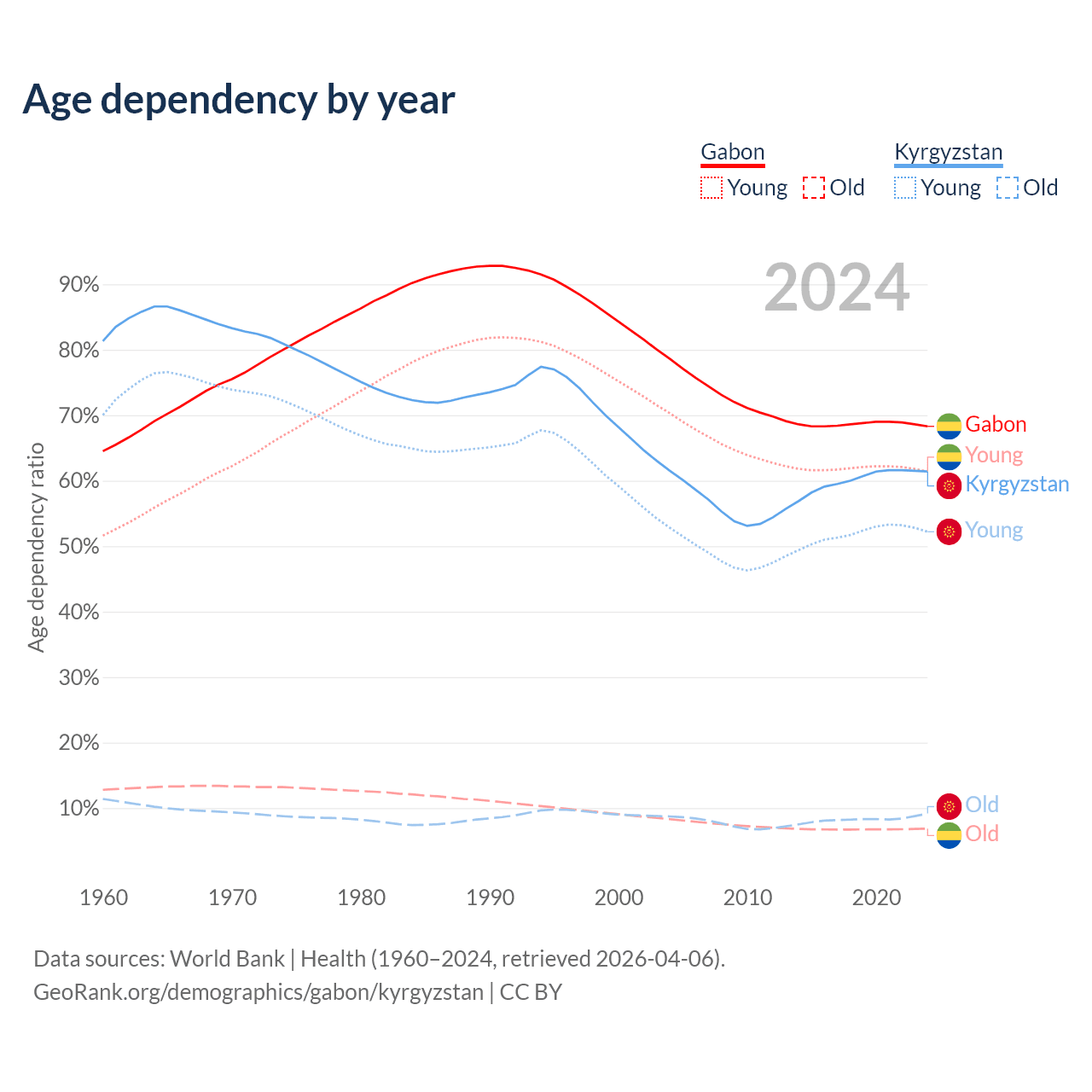 - The share of old-age demographic (65+) in Gabon is 4.08% vs 5.68% in Kyrgyzstan.