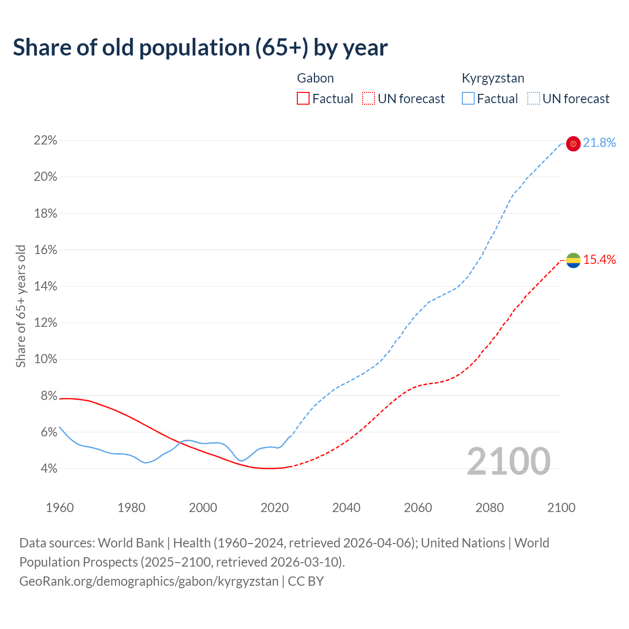 The share of older people aged 65 and over is 4.08% in Gabon and 5.68% in Kyrgyzstan. Life expectancy in Gabon compared to Kyrgyzstan .