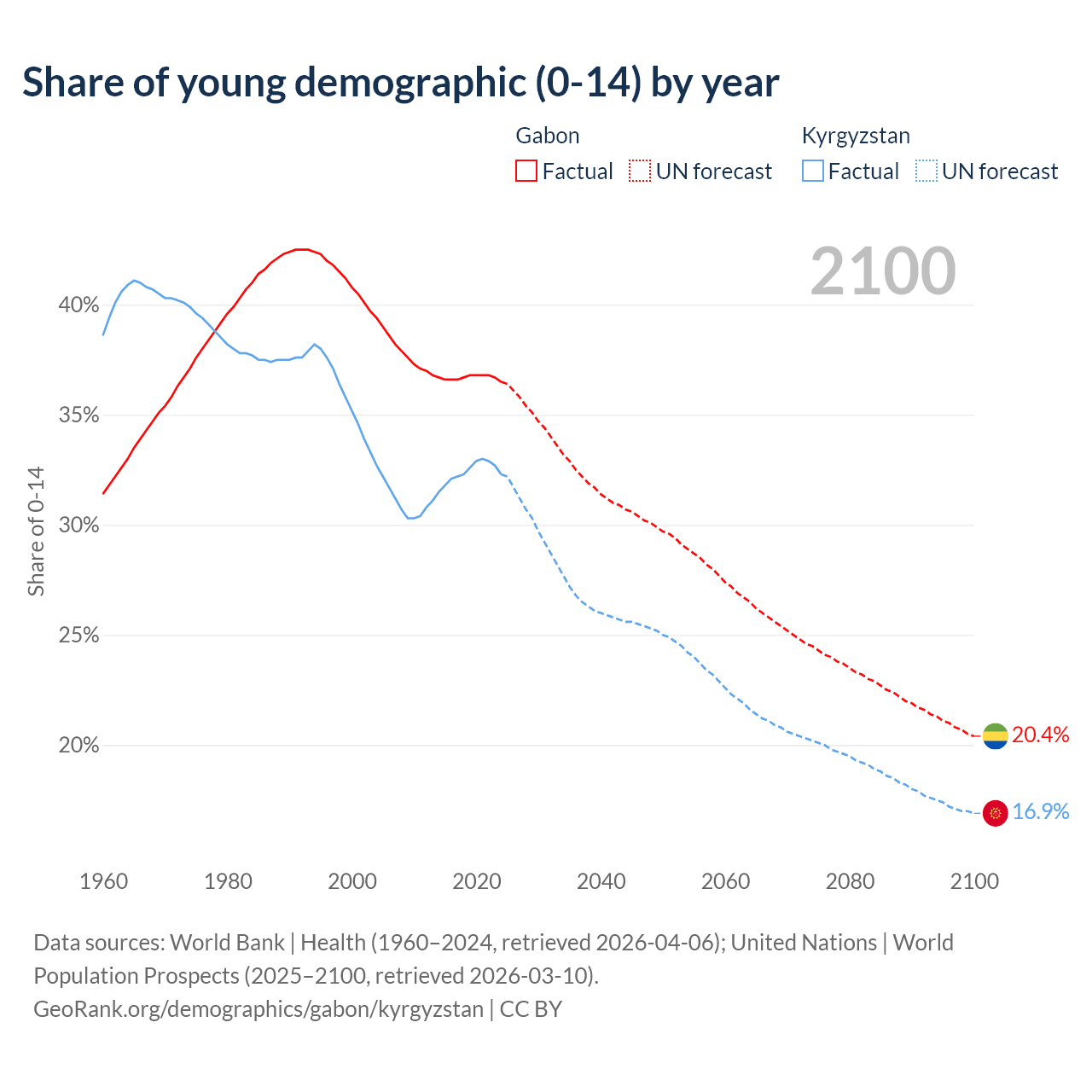 - The share of young demographic (0-15 years old) in Gabon is 36.5% vs 32.3% in Kyrgyzstan.