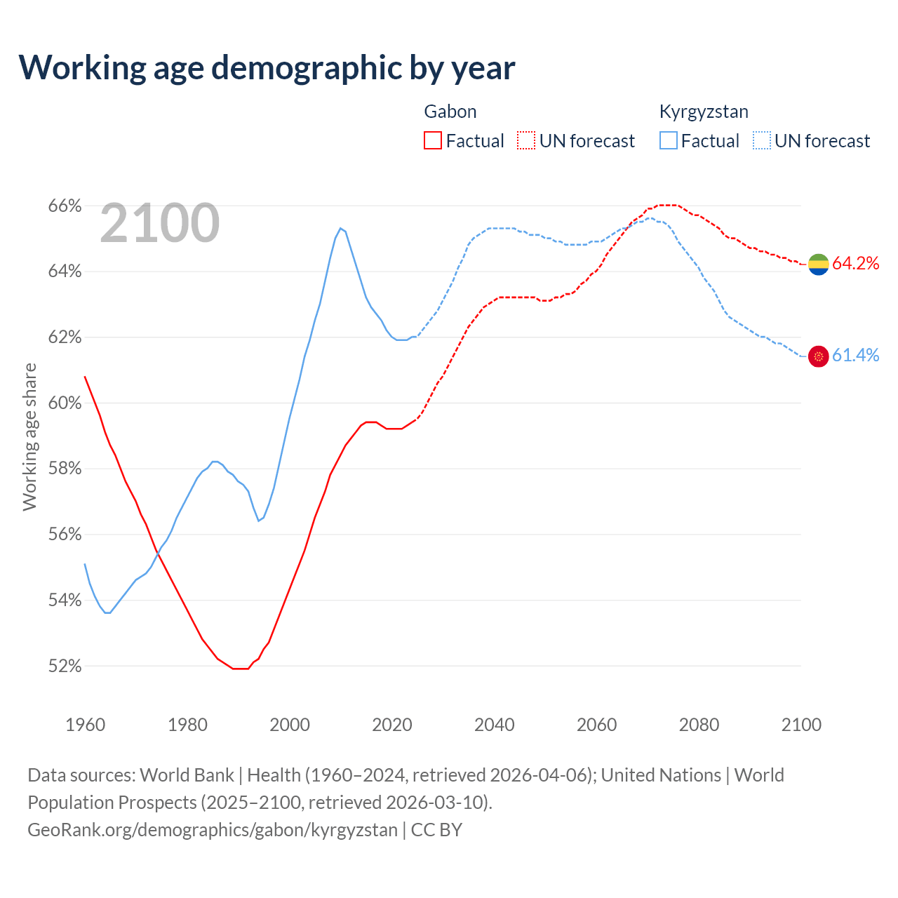 Median age Gabon vs Kyrgyzstan, 1960-2100