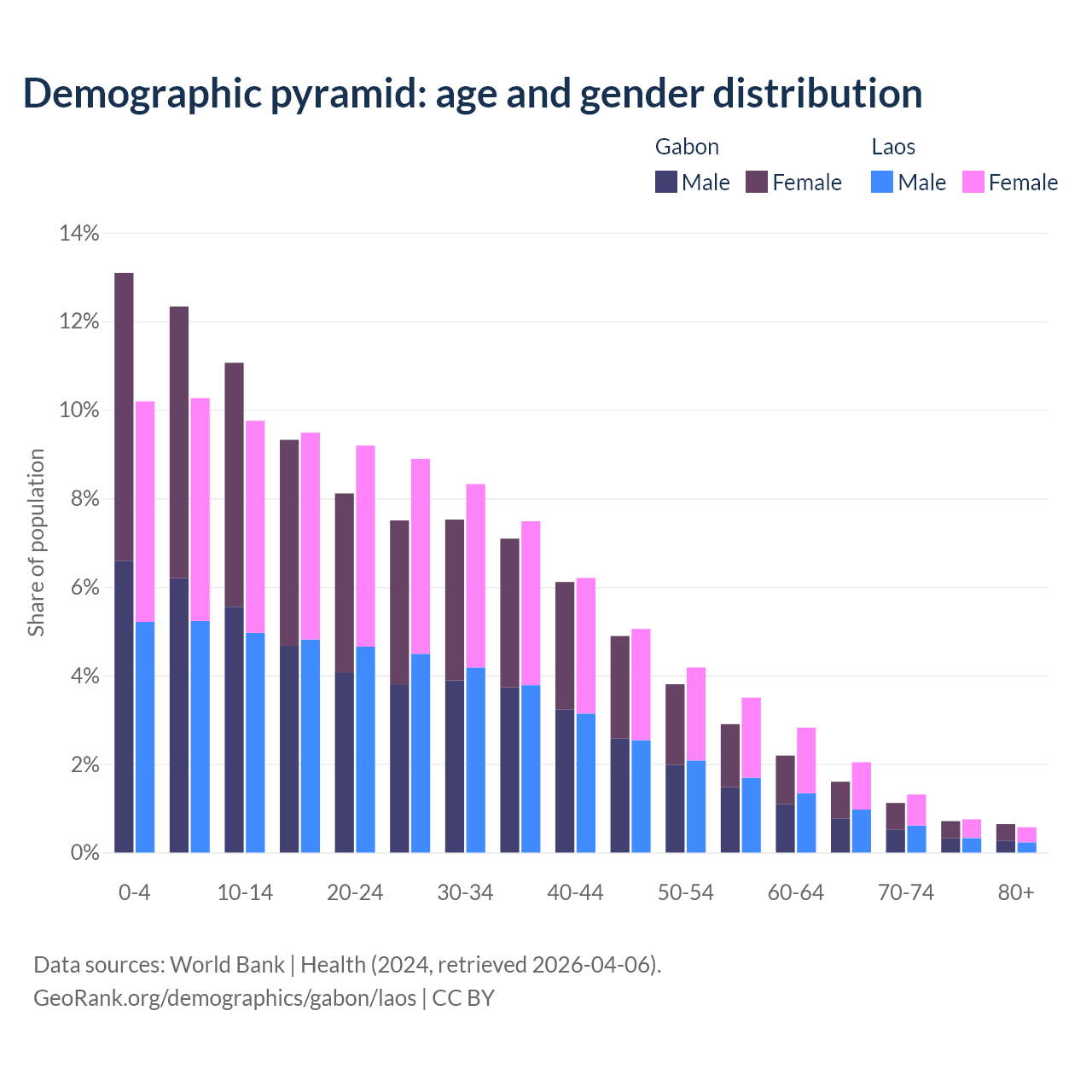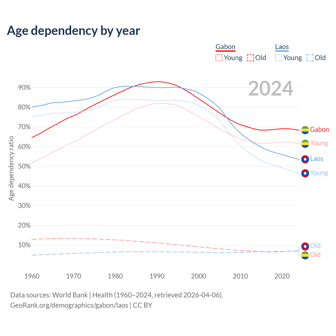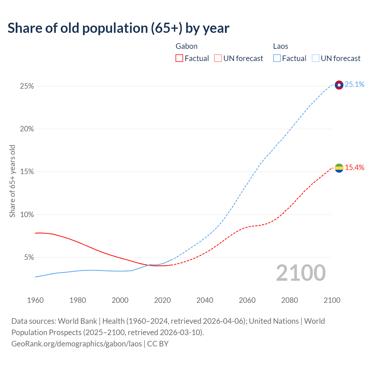 - The share of old-age demographic (65+) in Gabon is 4.08% vs 4.67% in Laos.