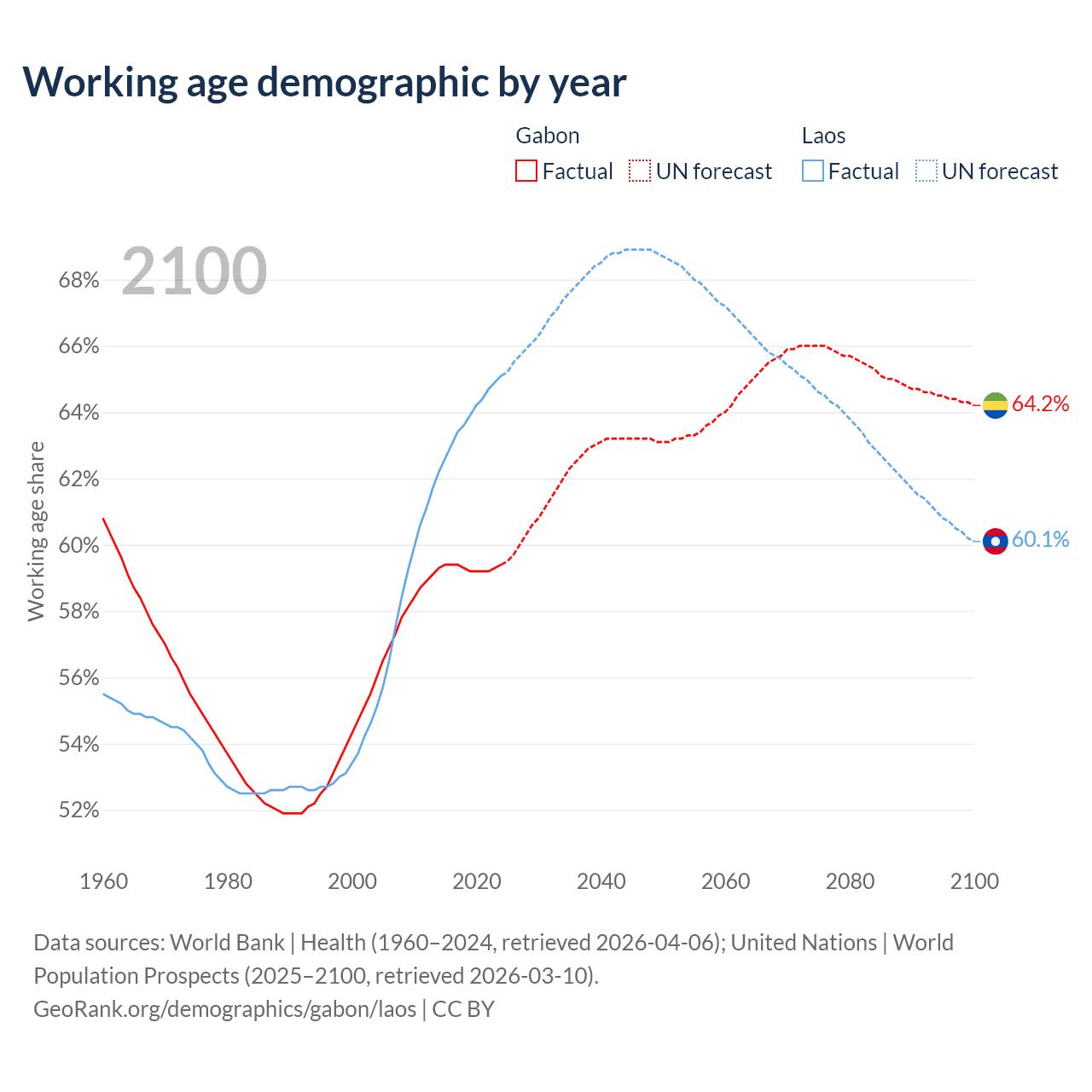 Median age Gabon vs Laos, 1960-2100