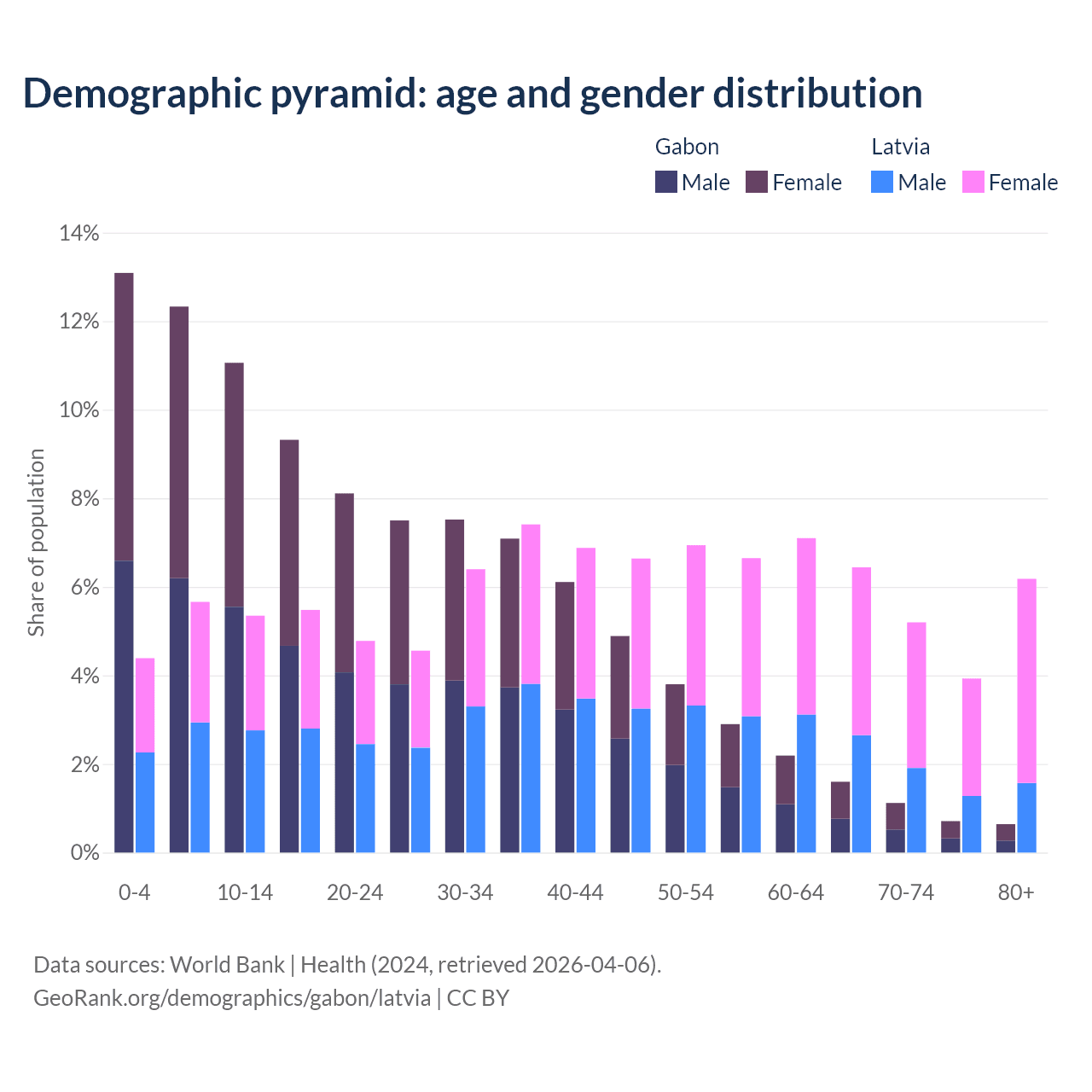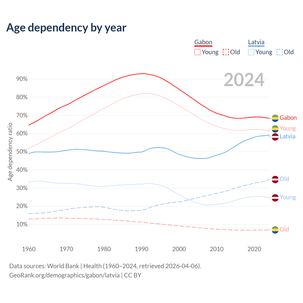 - Gabon is ranked 144/196 by median age (oldest to youngest) vs 20/196 for Latvia.
