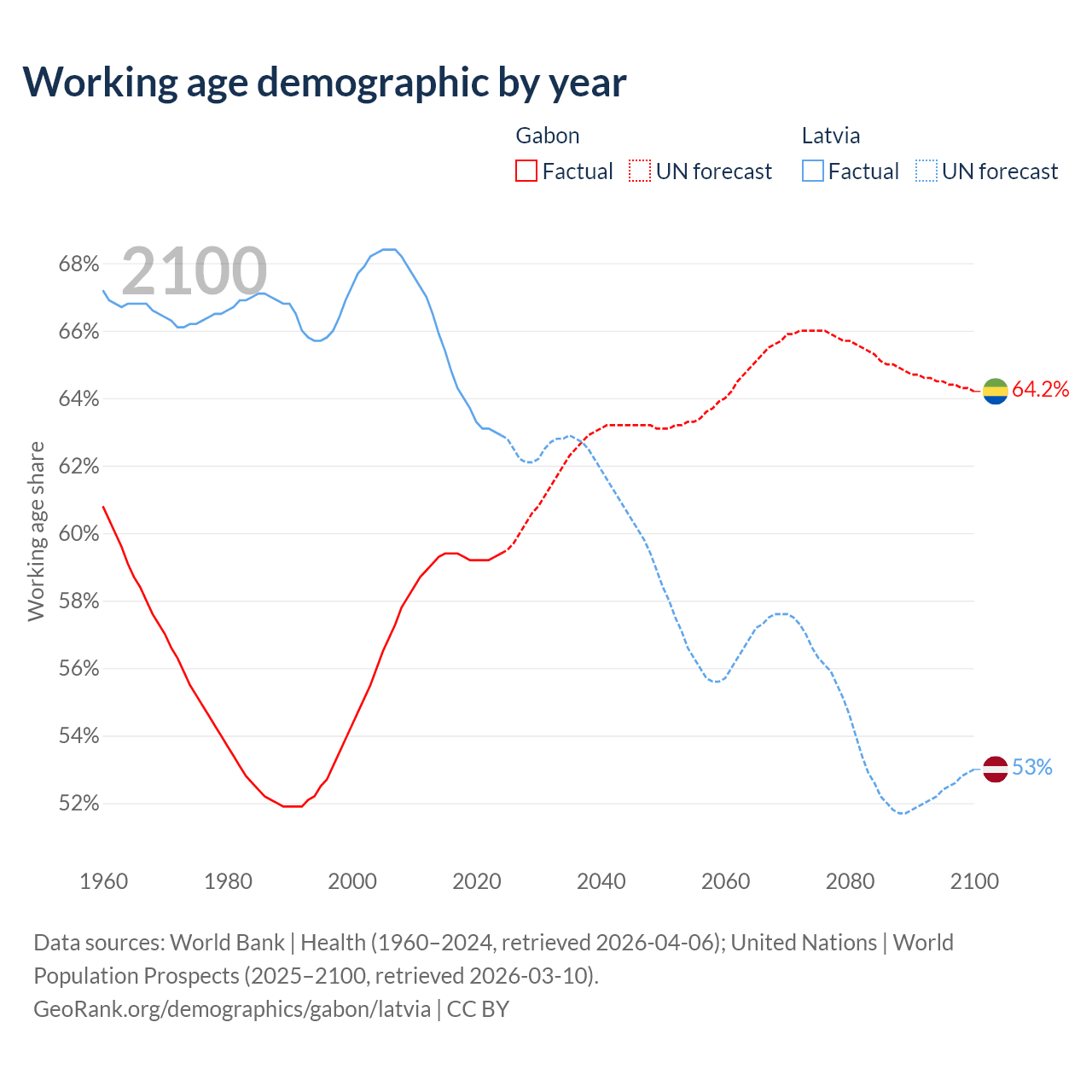 - Gabon has 1.58M working age adults (aged 15-64) vs 1.15M in Latvia.