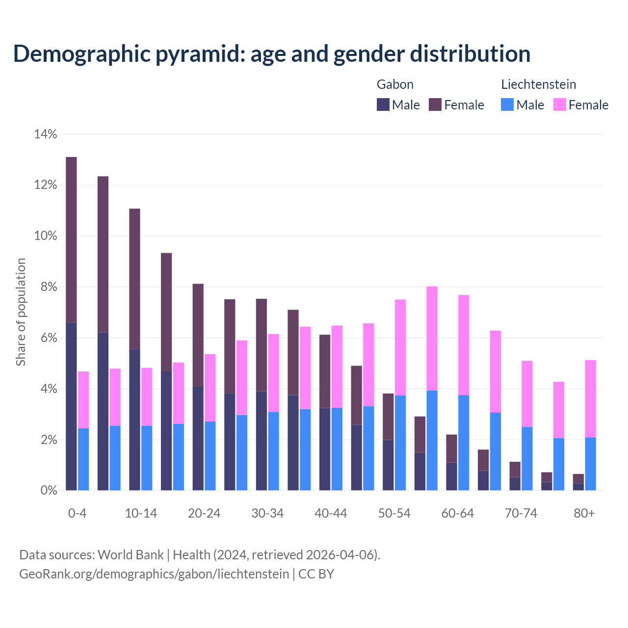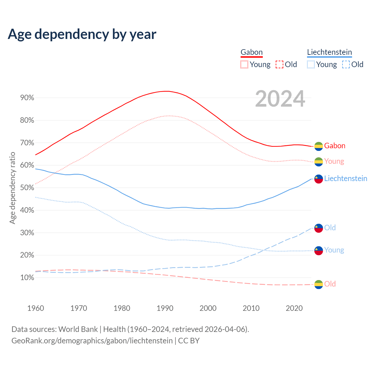 - The share of old-age demographic (65+) in Gabon is 4.08% vs 20.7% in Liechtenstein.