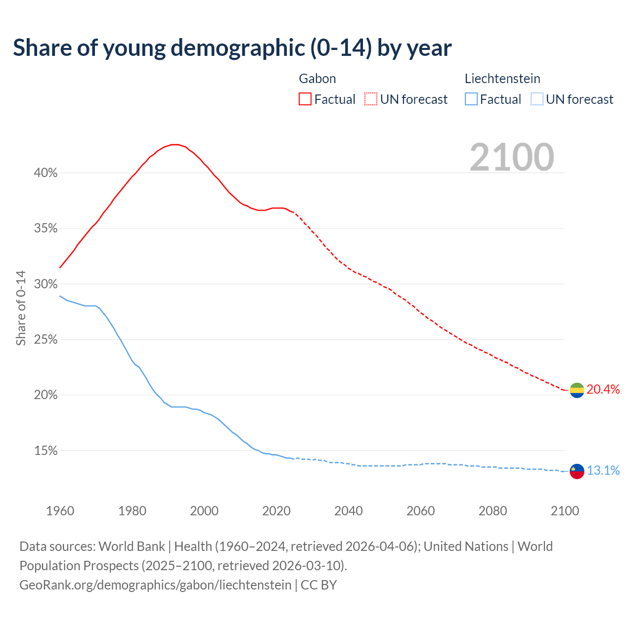 - The share of young demographic (0-15 years old) in Gabon is 36.5% vs 14.3% in Liechtenstein.