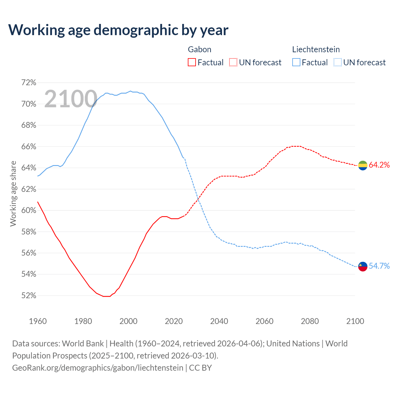- Gabon has 1.58M working age adults (aged 15-64) vs 26.7K in Liechtenstein.