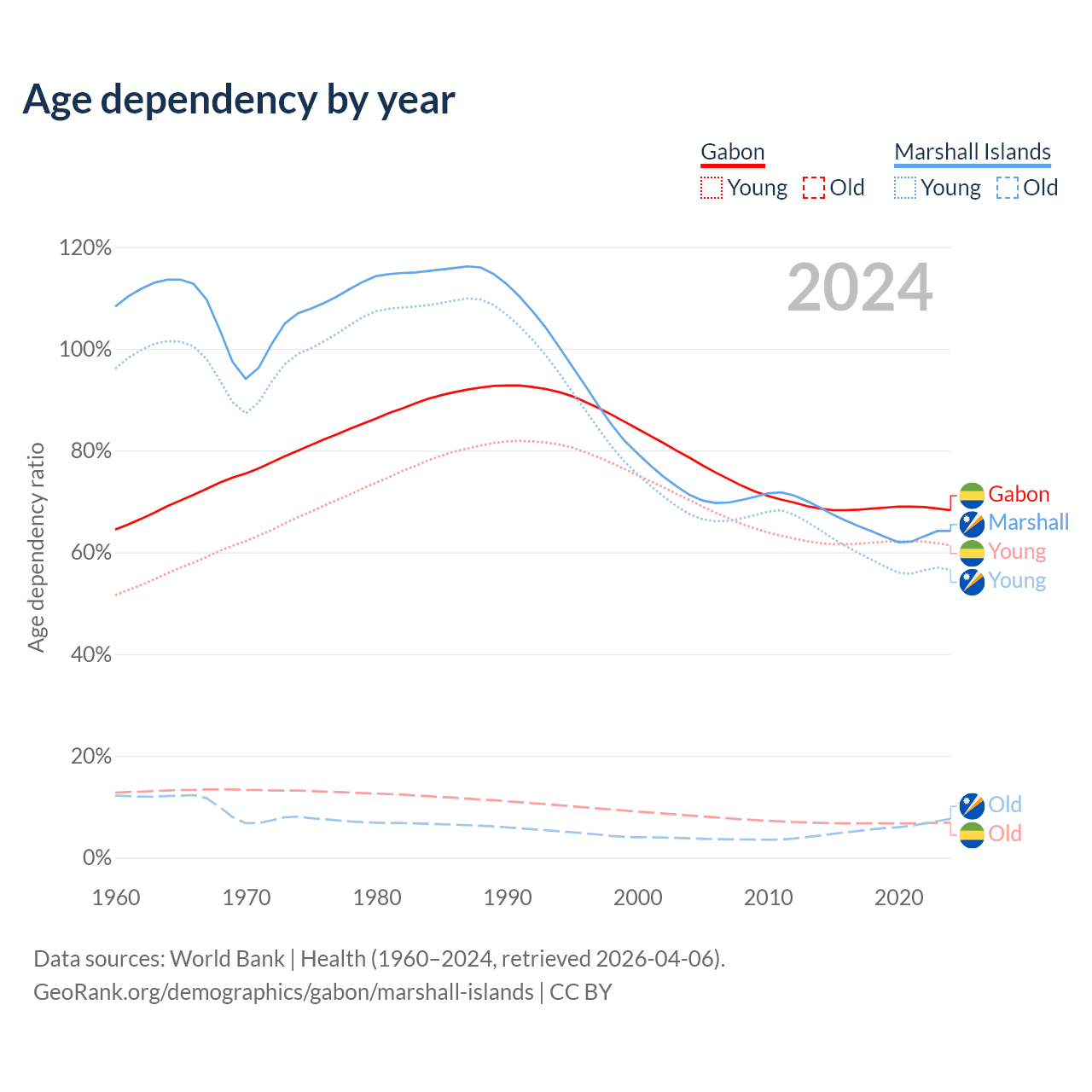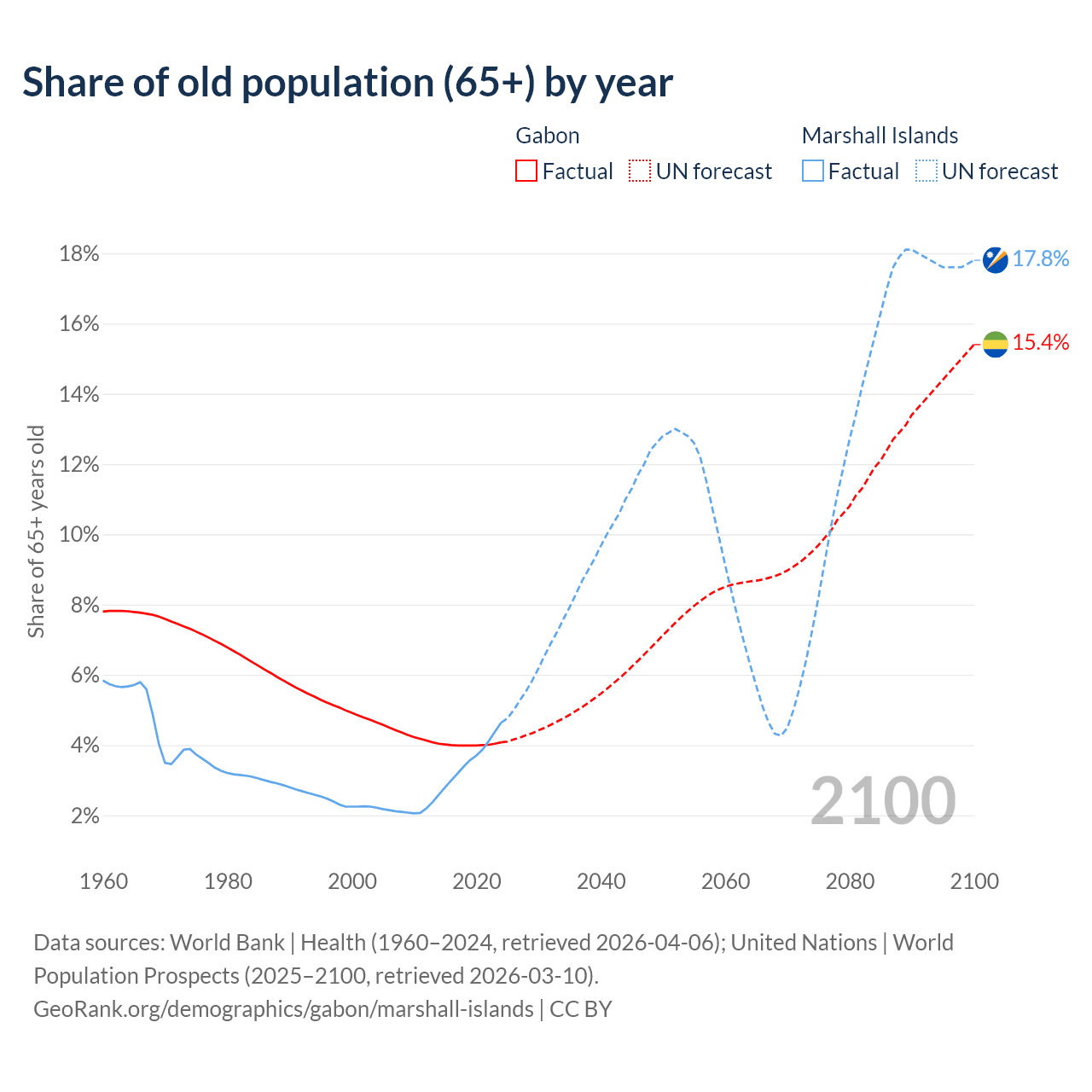 - The share of old-age demographic (65+) in Gabon is 4.08% vs 4.64% in the Marshall Islands.