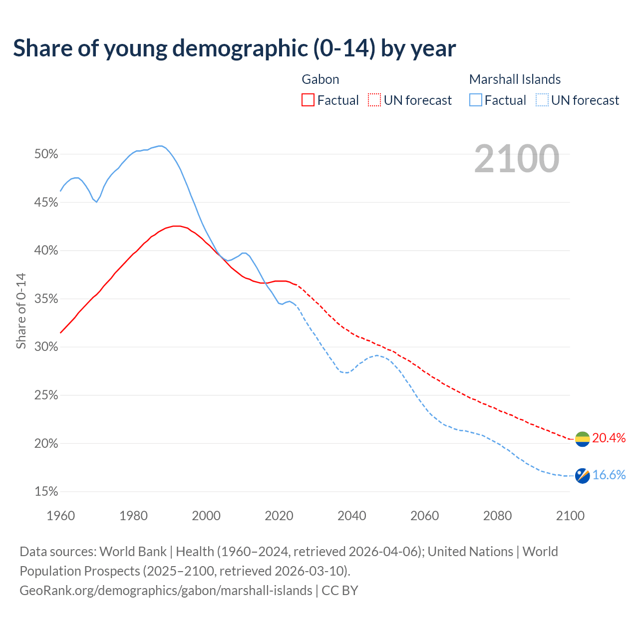 - The share of young demographic (0-15 years old) in Gabon is 36.5% vs 34.5% in the Marshall Islands.
