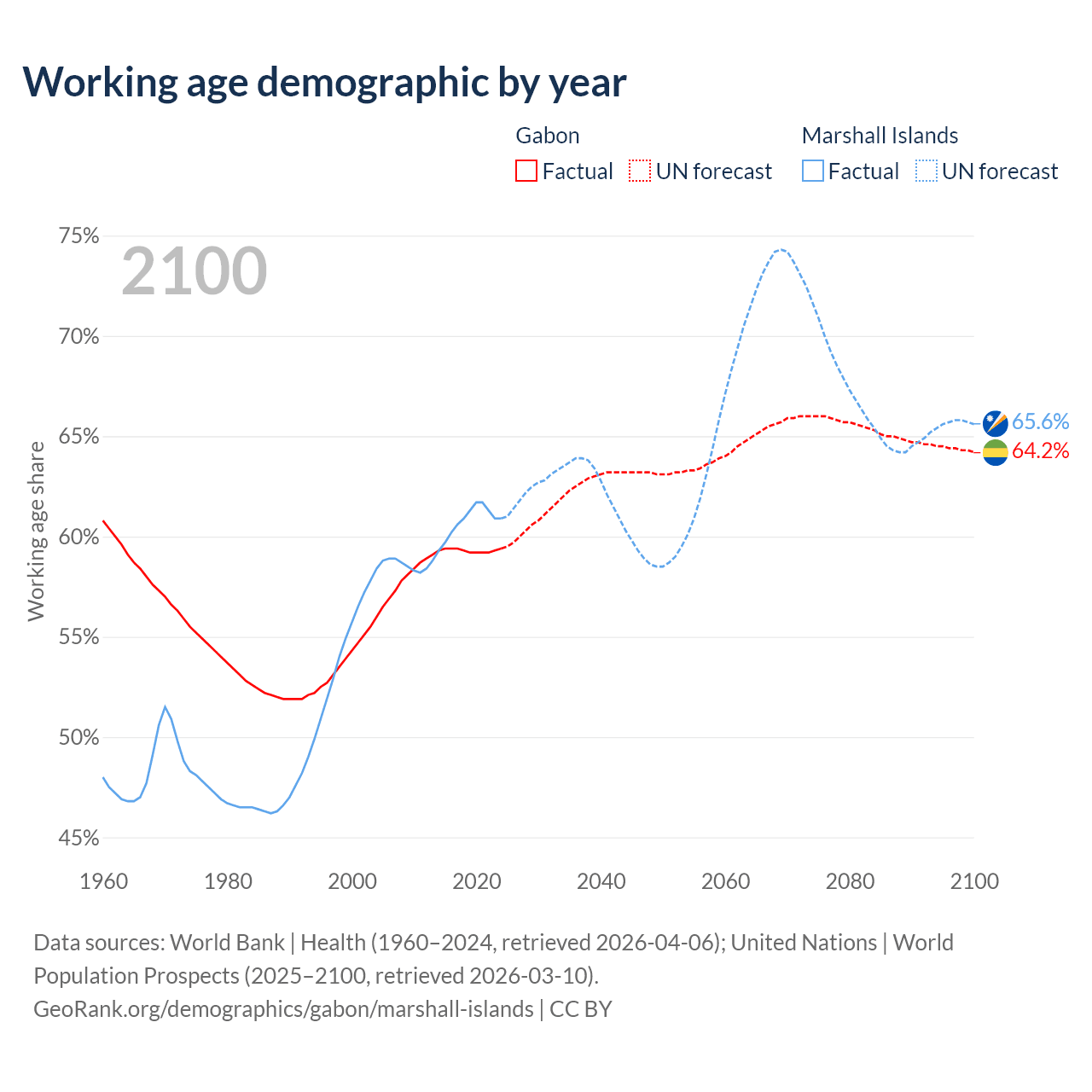 Median age Gabon vs Marshall Islands, 1960-2100