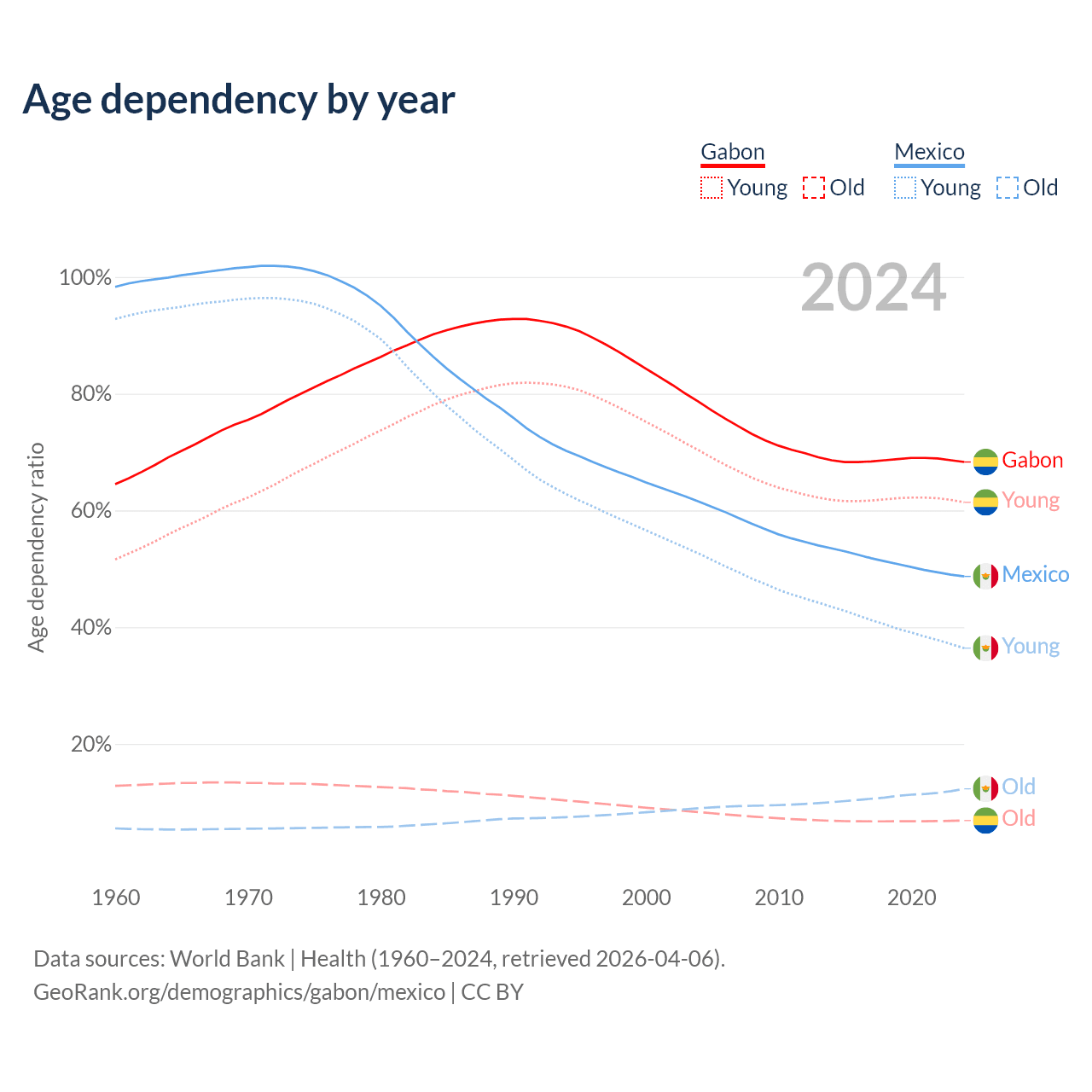 - Gabon is ranked 144/196 by median age (oldest to youngest) vs 102/196 for Mexico.