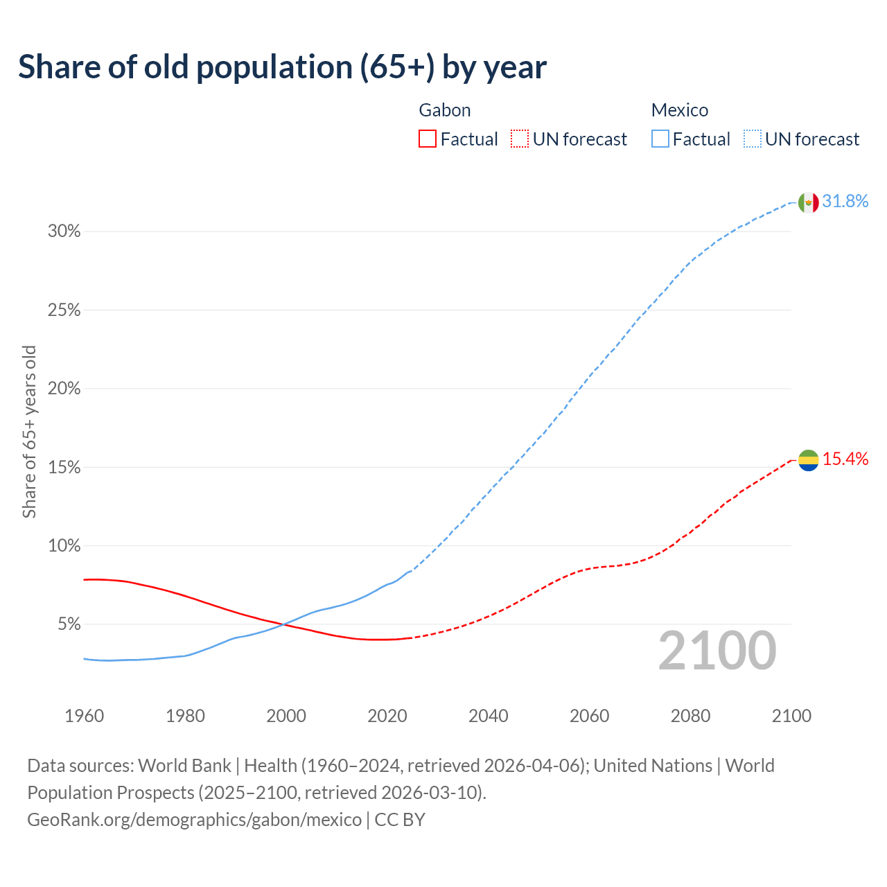 The share of older people aged 65 and over is 4.08% in Gabon and 8.25% in Mexico. Life expectancy in Gabon compared to Mexico .