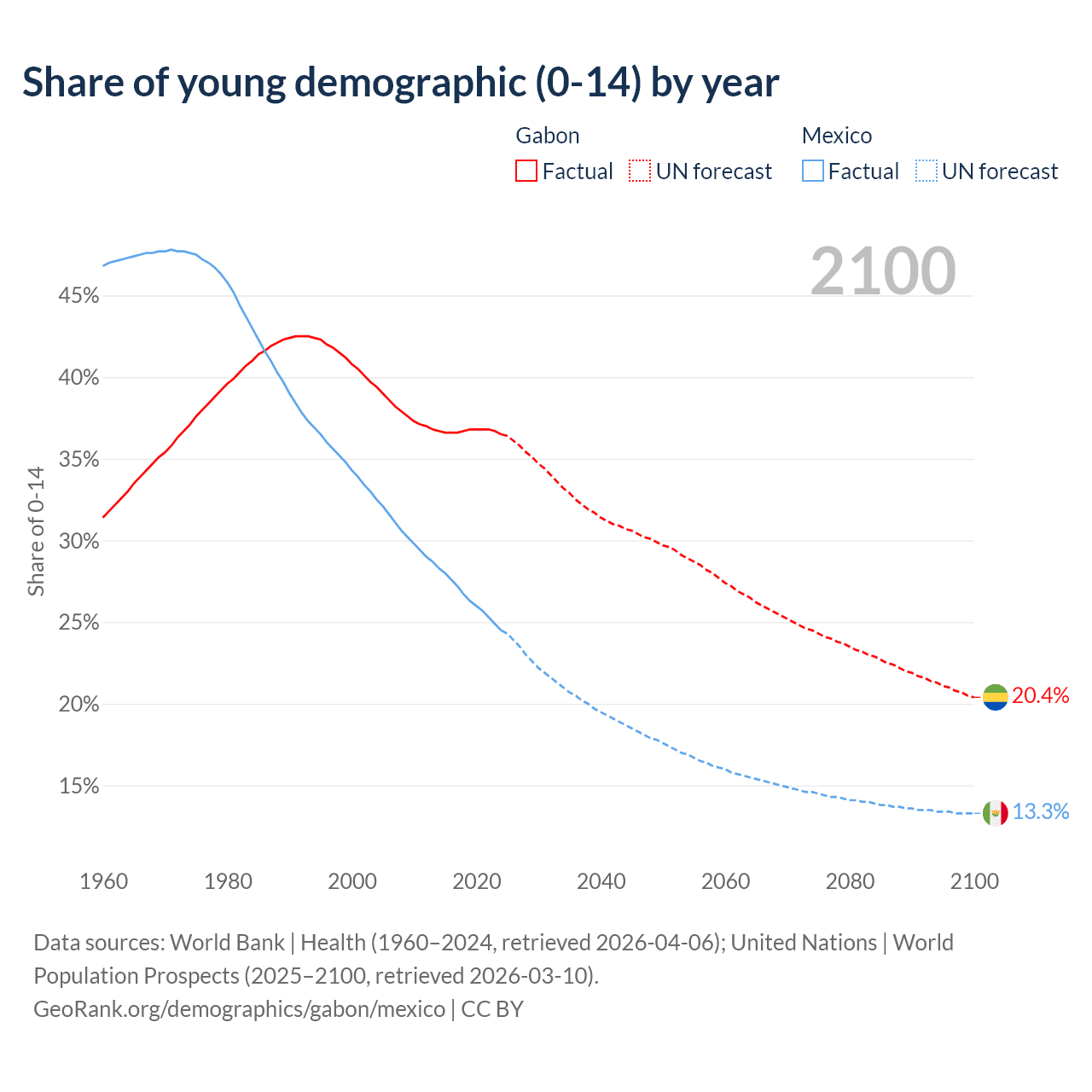 - The share of young demographic (0-15 years old) in Gabon is 36.5% vs 24.5% in Mexico.