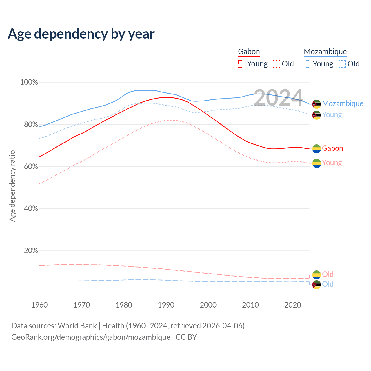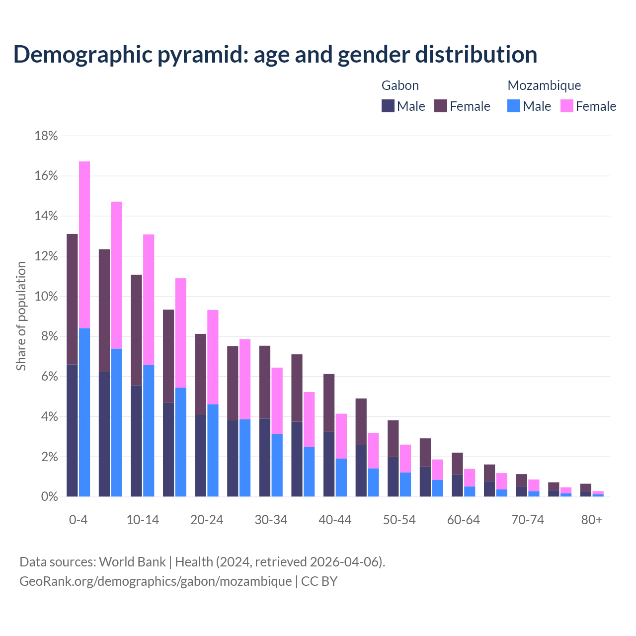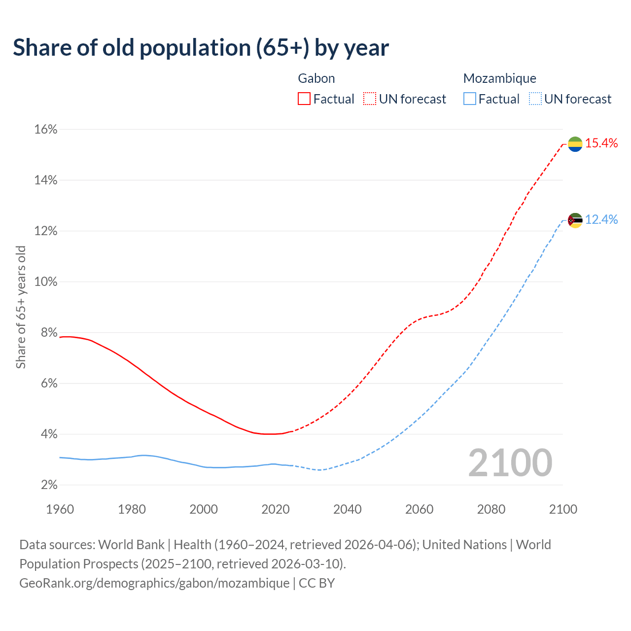 - The share of old-age demographic (65+) in Gabon is 4.08% vs 2.75% in Mozambique.