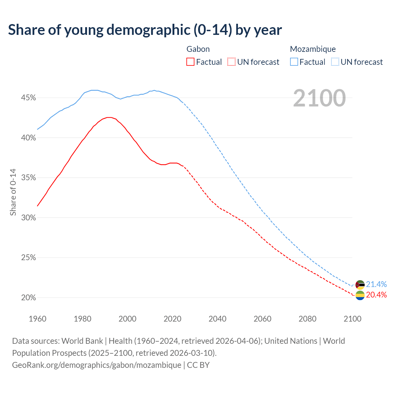 Median age Gabon vs Mozambique, 1960-2100