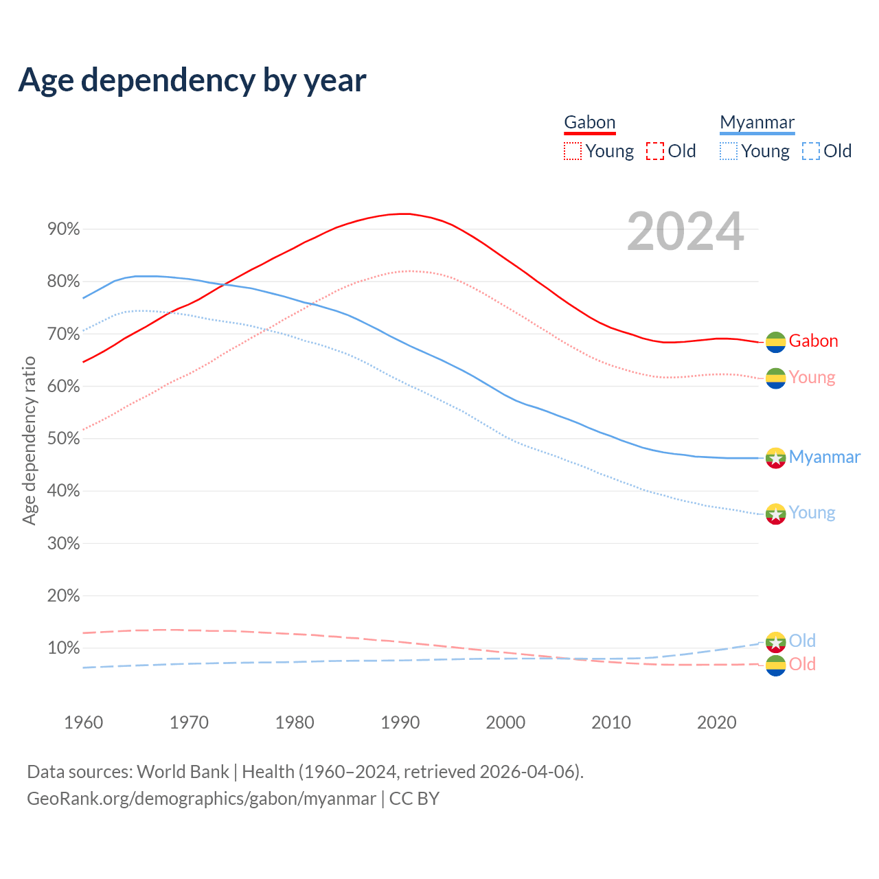 - Gabon is ranked 144/196 by median age (oldest to youngest) vs 96/196 for Myanmar.