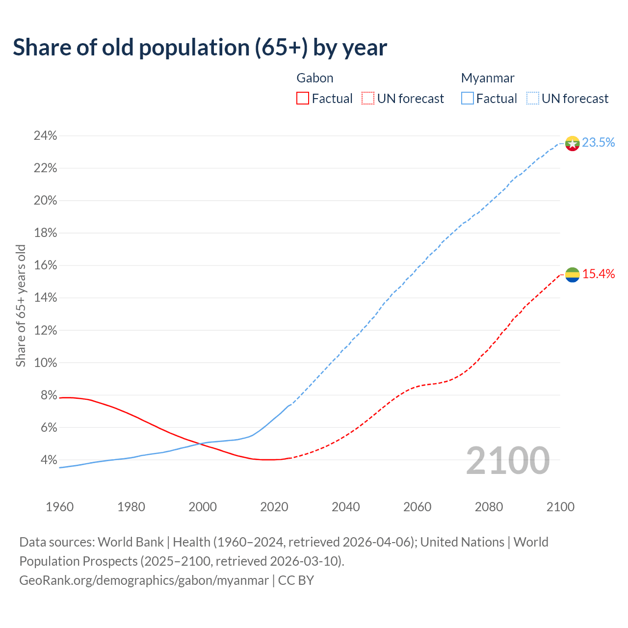 The share of older people aged 65 and over is 4.08% in Gabon and 7.3% in Myanmar. Life expectancy in Gabon compared to Myanmar .