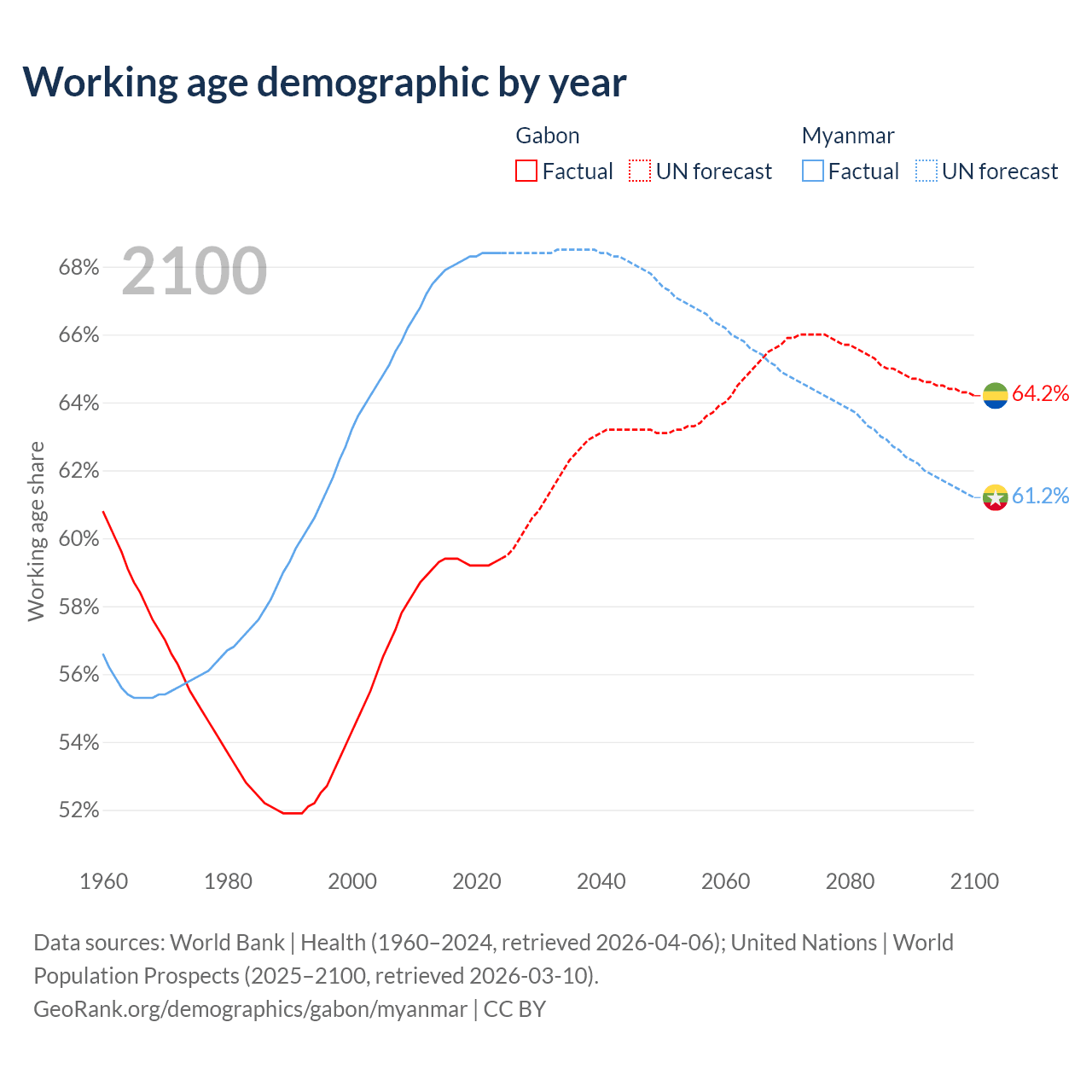 - Gabon has 1.58M working age adults (aged 15-64) vs 37.8M in Myanmar.
