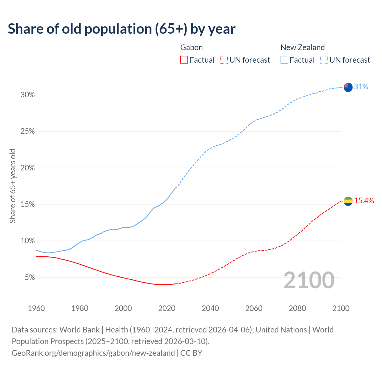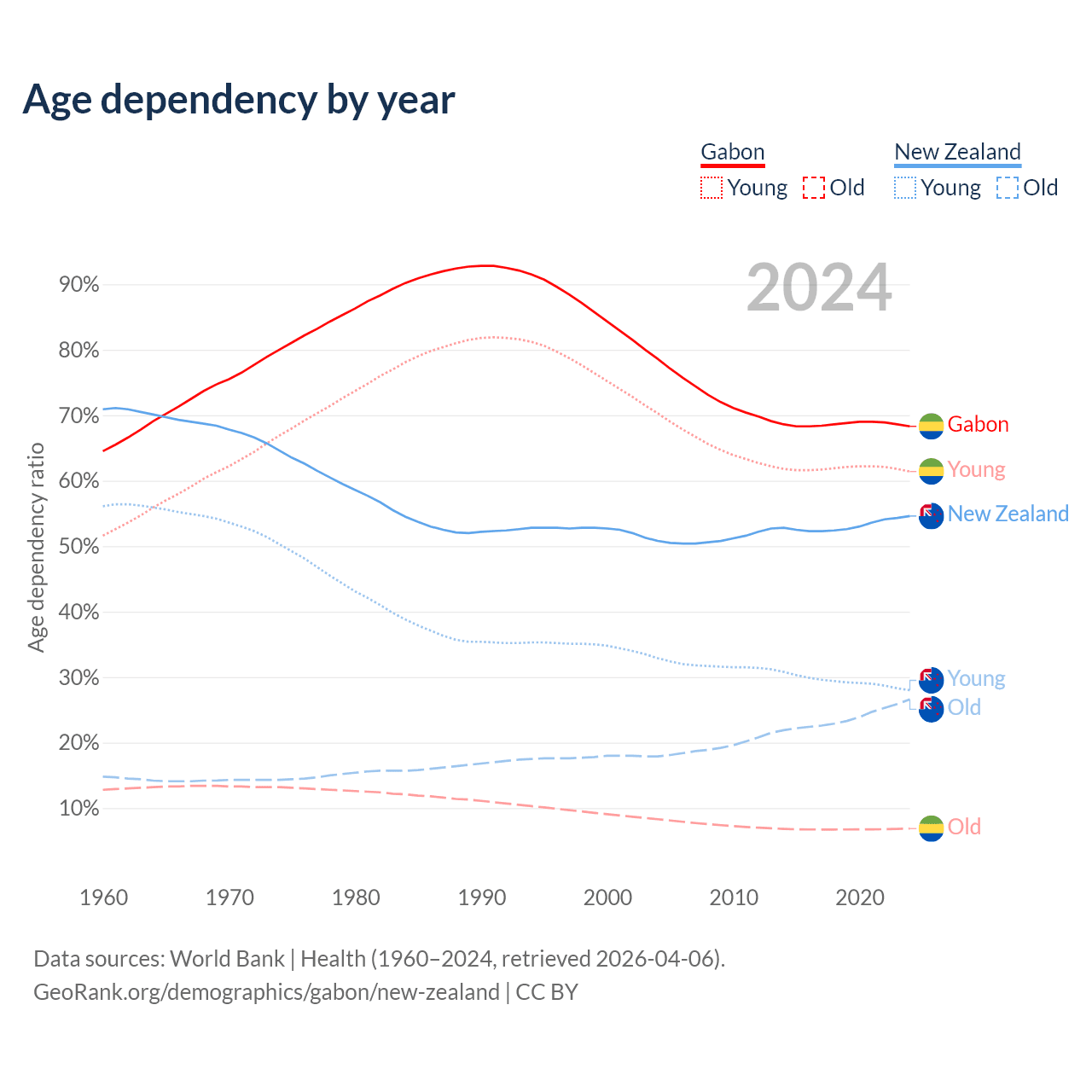 - The share of old-age demographic (65+) in Gabon is 4.08% vs 17.2% in New Zealand.