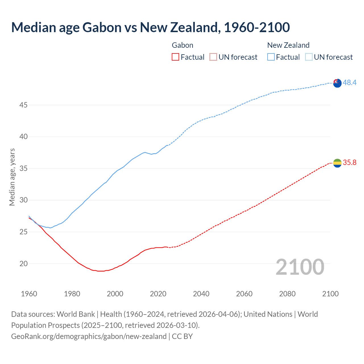 Median age Gabon vs New Zealand, 1960-2100