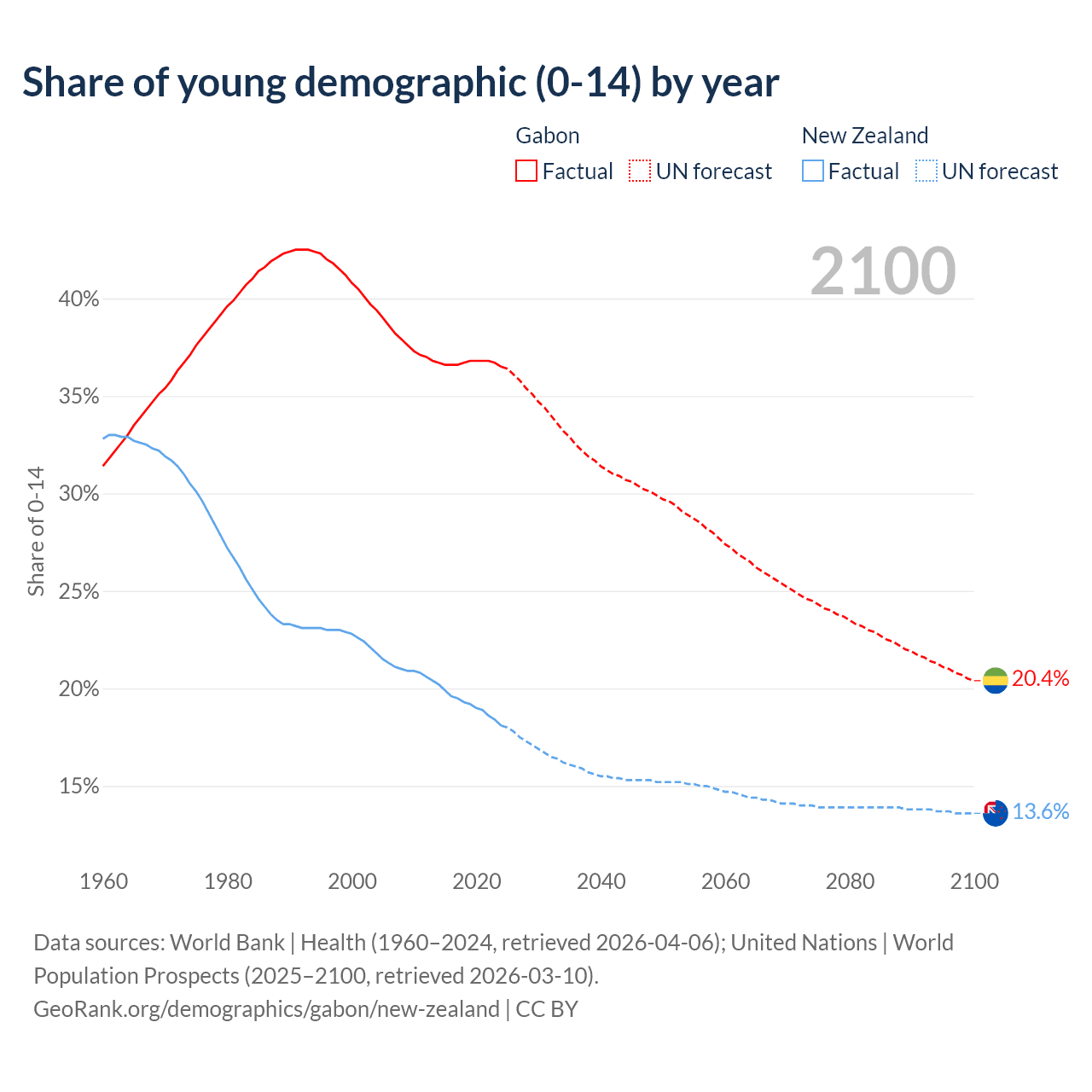 - The share of young demographic (0-15 years old) in Gabon is 36.5% vs 18.1% in New Zealand.